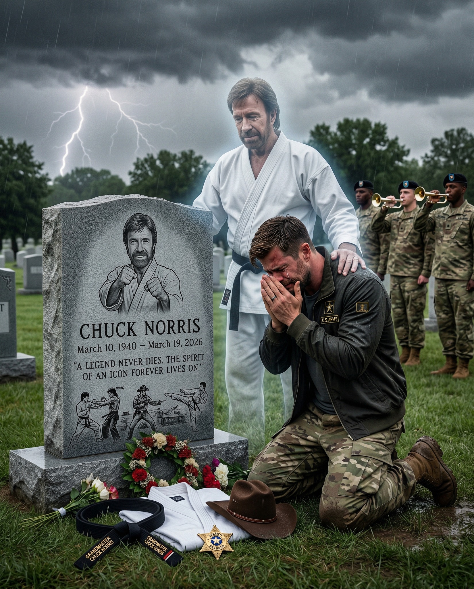 In solemn remembrance of Chuck Norris, a figure whose strength, discipline, and spirit transcended generations, the world paused in quiet reflection. The day felt heavier, as though time itself slowed to honor a life that left an indelible mark on history. Beneath a gray, endless sky, a gentle wind moved across a silent field of gravestones, carrying with it a sense of respect and unspoken sorrow.