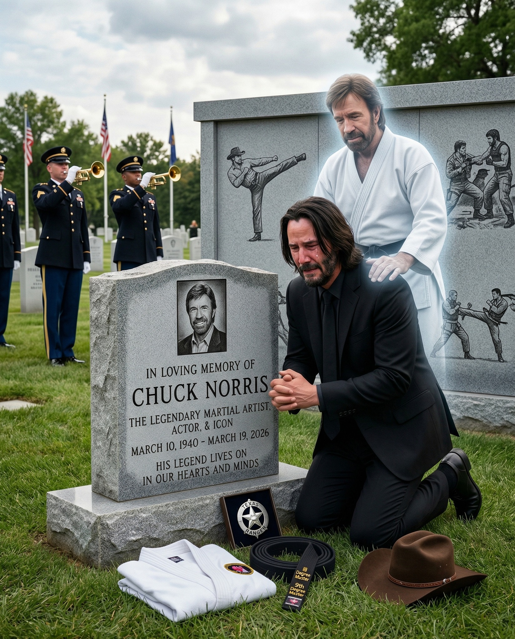 Kneeling before his grave, Keanu Reeves remained still, his head bowed deeply. Known for his calm presence and quiet resilience, he appeared overcome not by weakness, but by a depth of emotion that could no longer remain hidden. Before him stood the gravestone of Chuck Norris, etched with dignity, capturing the image of a man who had become far more than an actor.