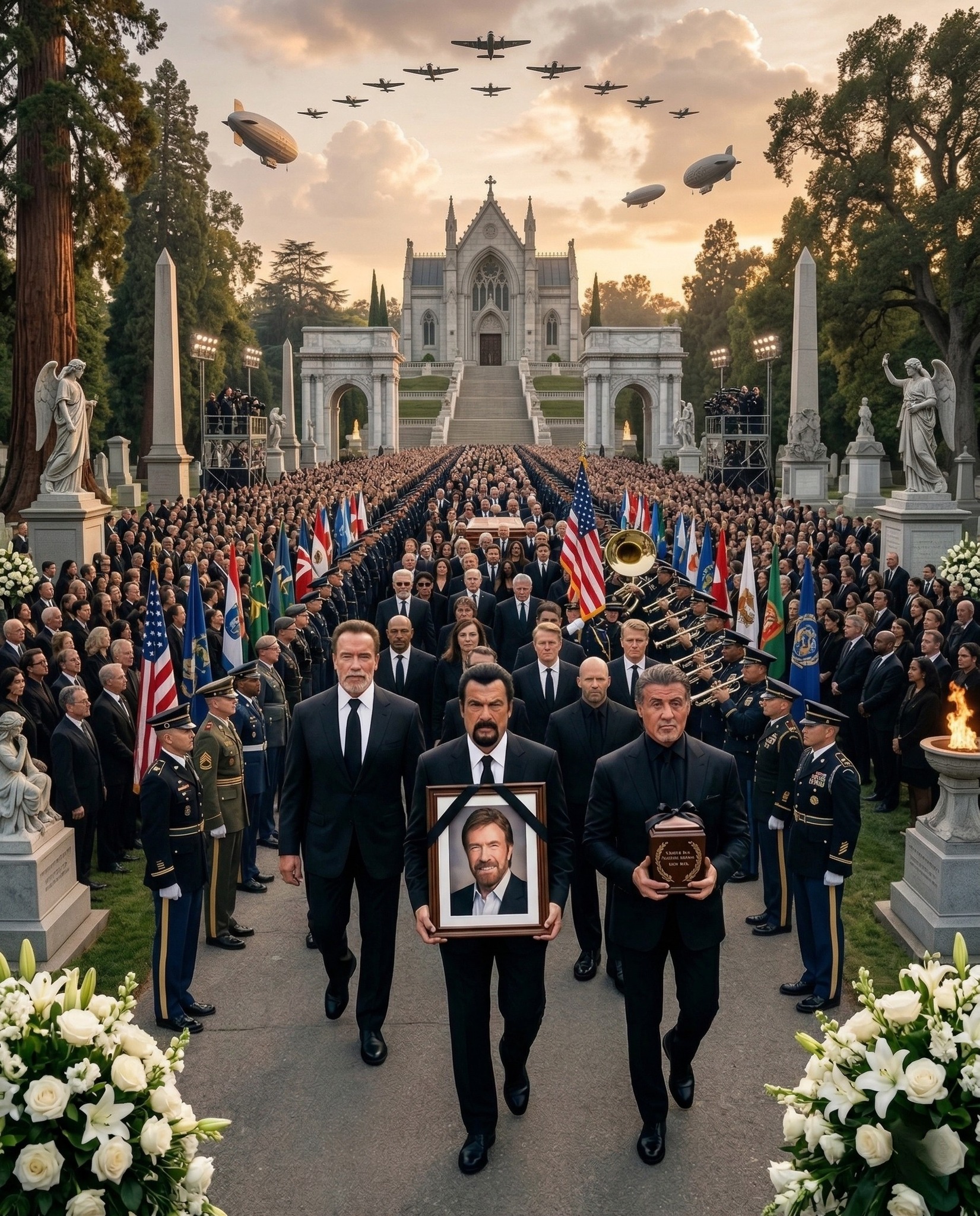 A tribute worthy of a king, a warrior, and a true American hero. When a figure of this magnitude takes his final bow, the world does not simply observe—it pauses. Time itself seems to slow as millions reflect on a life that left an indelible mark on both screen and spirit. To witness fellow icons of the film industry leading the procession, carrying the memory of their brother-in-arms, is a powerful reminder of how deeply one individual can influence generations.