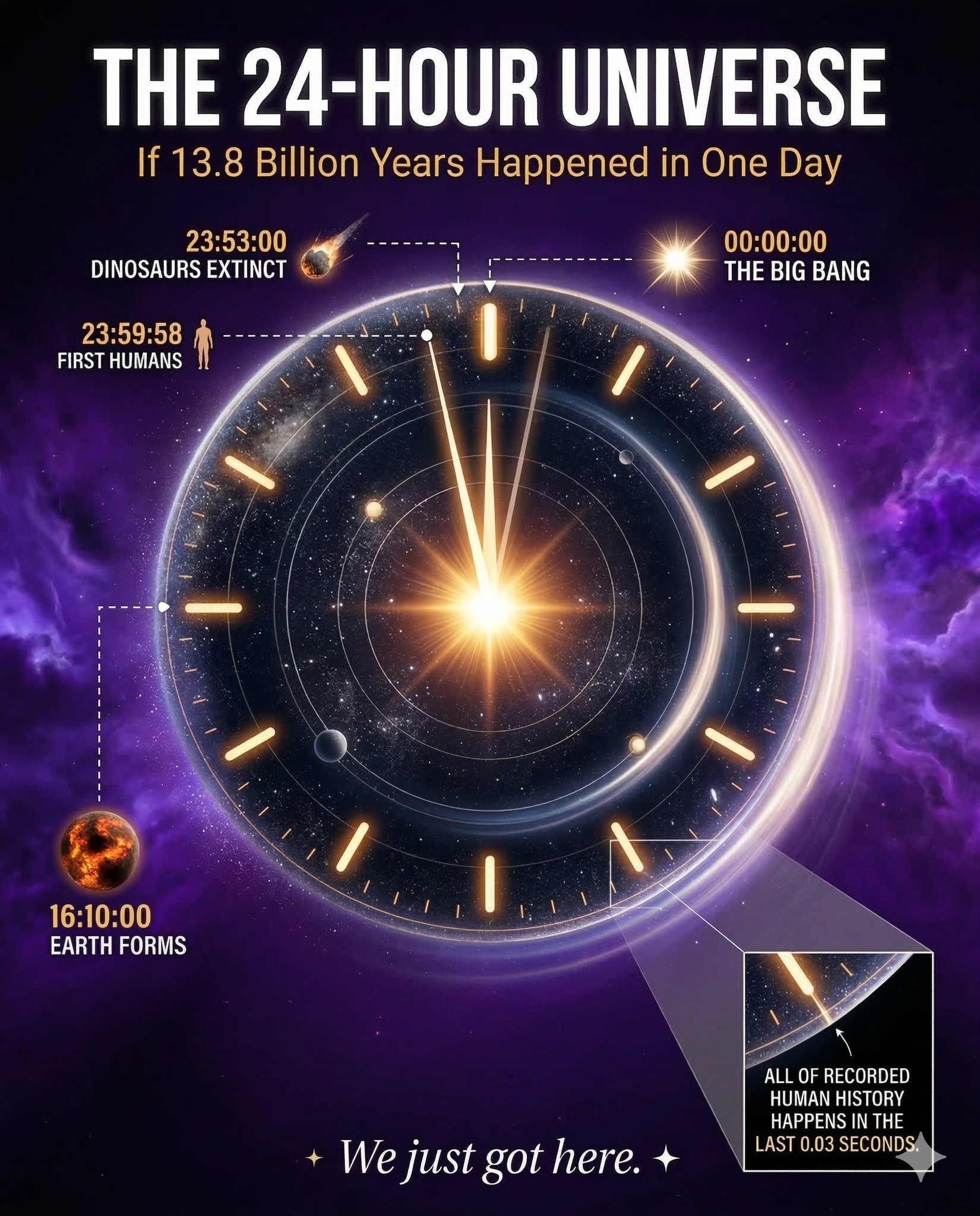 That means all of recorded human history — every empire, every discovery, every moment of art, science, and civilization — unfolds in just the final 0.03 seconds before midnight.