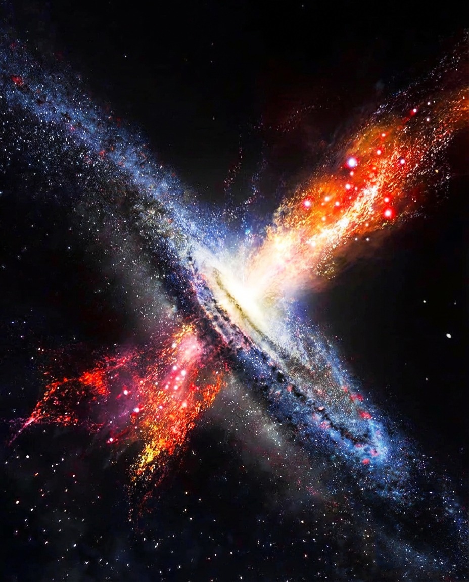 At its heart rages a supermassive black hole 1.6 billion times the mass of our Sun — a devouring giant born impossibly early, already fully formed and hungry.