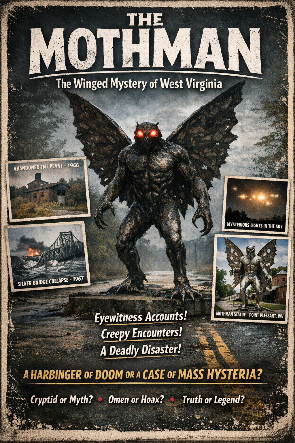Among the many unexplained creatures in modern folklore, few are as eerie and mysterious as the Mothman. Described as a large winged humanoid with glowing red eyes, the creature became famous after a series of sightings in the 1960s in Point Pleasant.