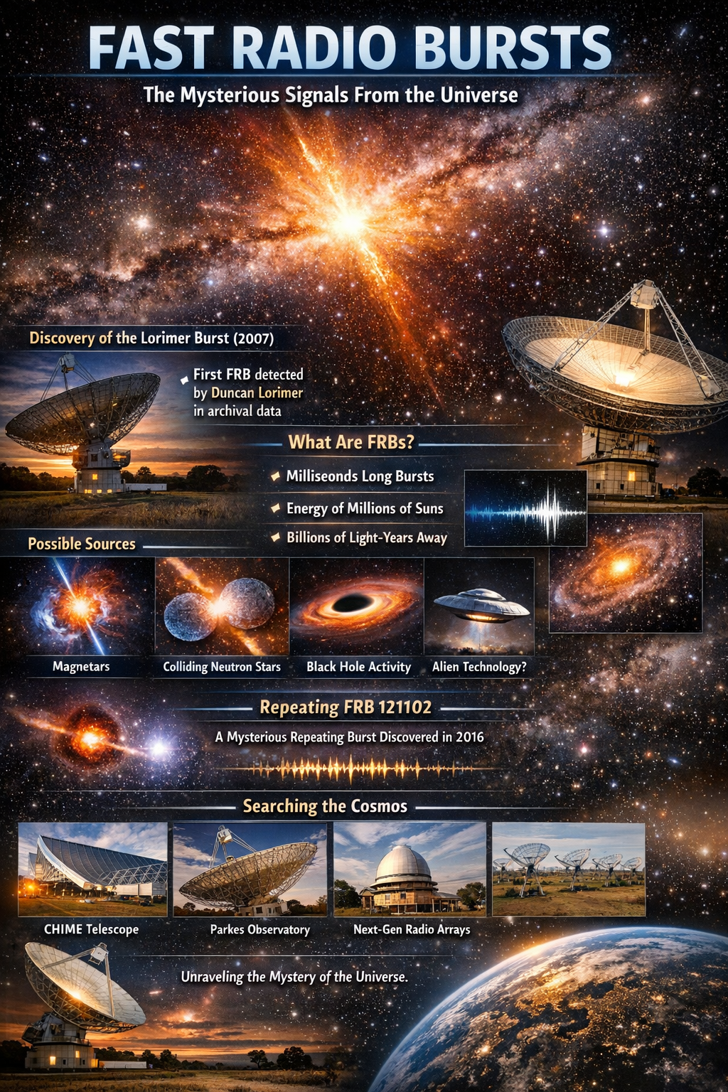 The first known Fast Radio Burst was discovered in 2007 by astronomer Duncan Lorimer and his research team.
