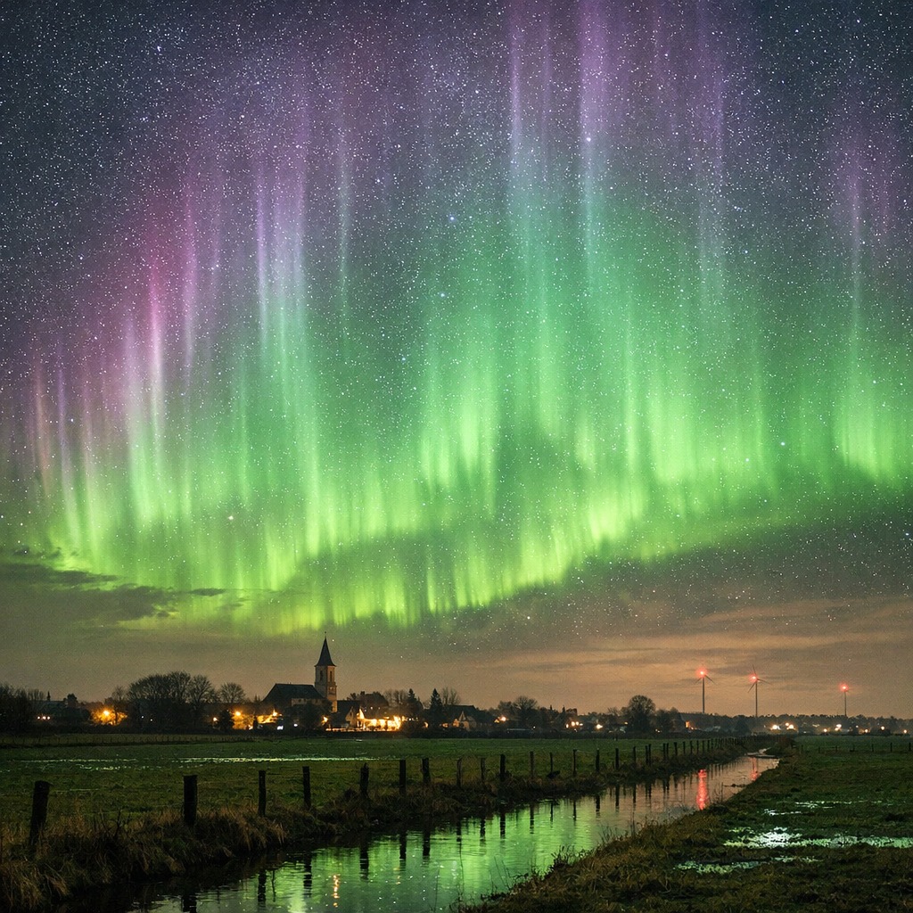 Many residents stepped outside to witness the shimmering spectacle overhead, while others captured stunning photographs of the aurora glowing above historic buildings, windmills, forests, and open fields. Social media quickly filled with images and videos as people shared their amazement at seeing this polar phenomenon in an unexpected place.