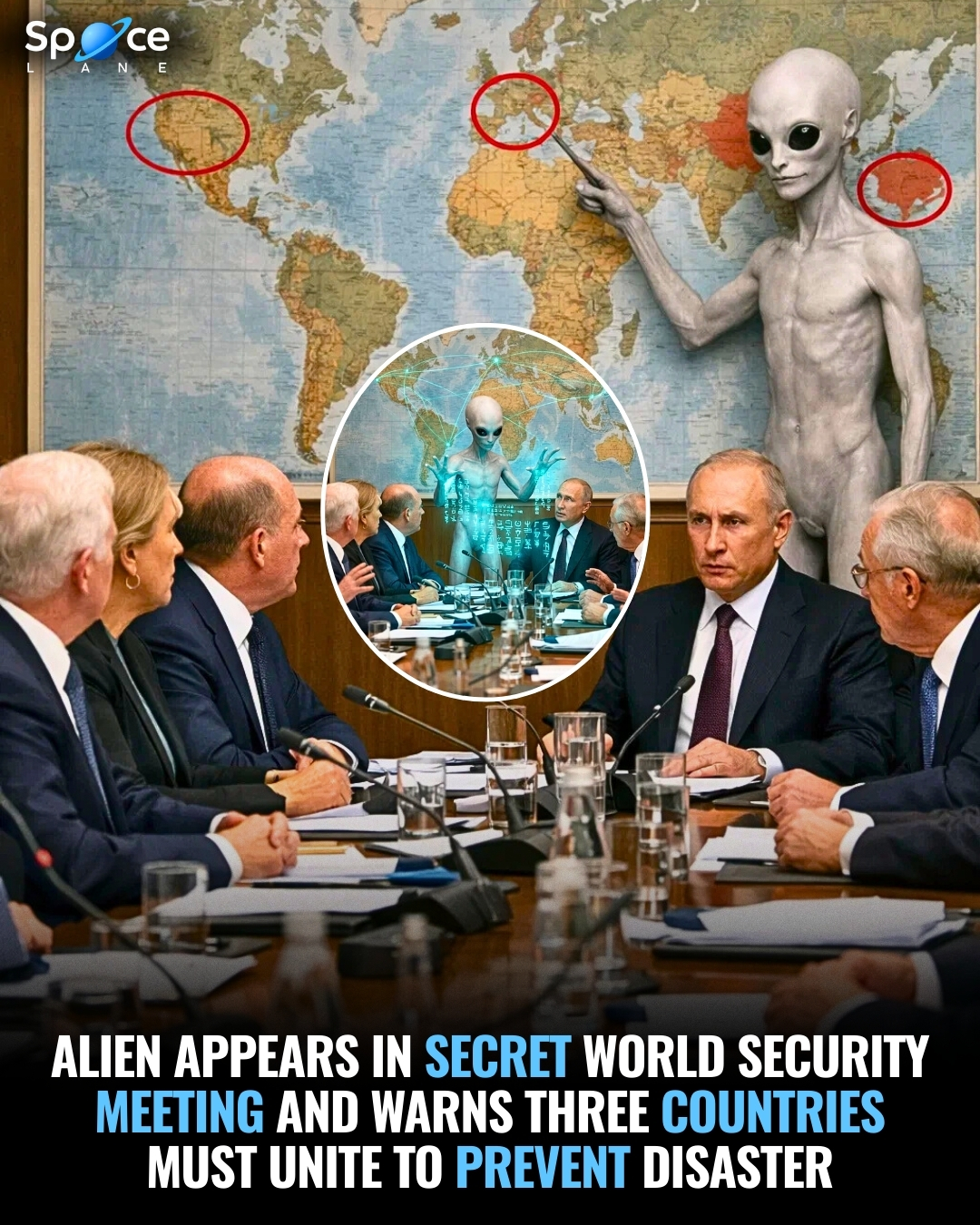 Witnesses claimed that a tall unknown figure suddenly appeared during the meeting. The being looked different from any human and calmly walked toward a large world map placed on the wall. Security guards were reportedly frozen in shock as the figure pointed toward three specific countries.
