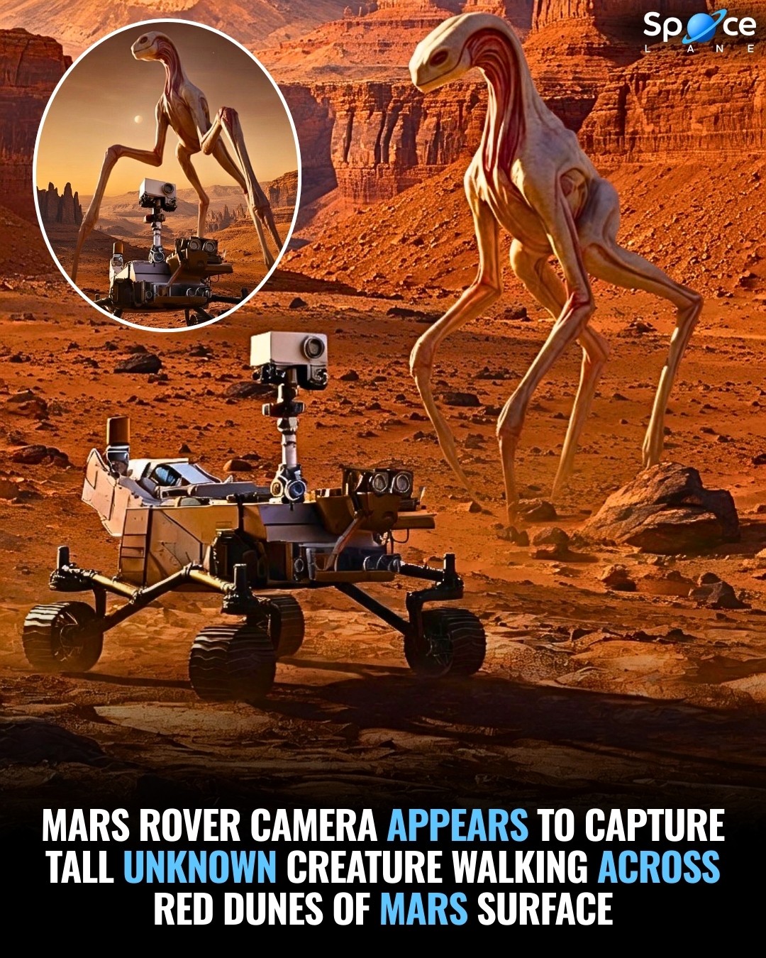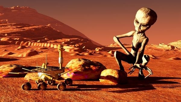 A strange image has started a new discussion about life on Mars. The picture appears to show a Mars rover exploring the dusty red landscape while a tall unknown creature stands nearby in the distance. The shape looks very different from any rock formation normally seen on the Martian surface.