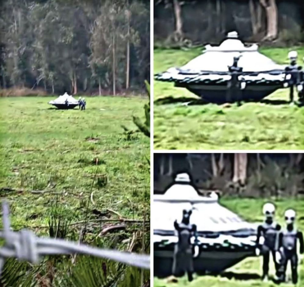 FIELD CORRESPONDENT – A series of grainy but compelling photographs has surfaced today, allegedly showing a small, metallic craft grounded in a remote meadow. The images, reportedly taken by a long-range wildlife camera, depict a scene that has left both local authorities and the online community searching for answers: a structured object resting on the grass with several humanoid figures standing in close proximity.