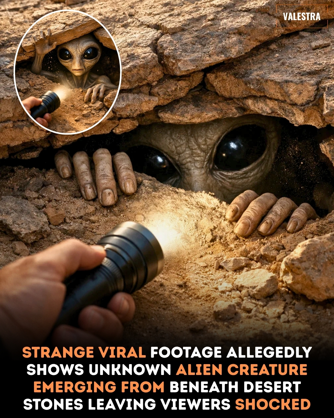 Across social media platforms a mysterious video has begun circulating that has captured the curiosity of millions of viewers. The clip reportedly shows a strange humanoid creature hiding beneath cracked desert rocks while someone shines a flashlight toward the opening.