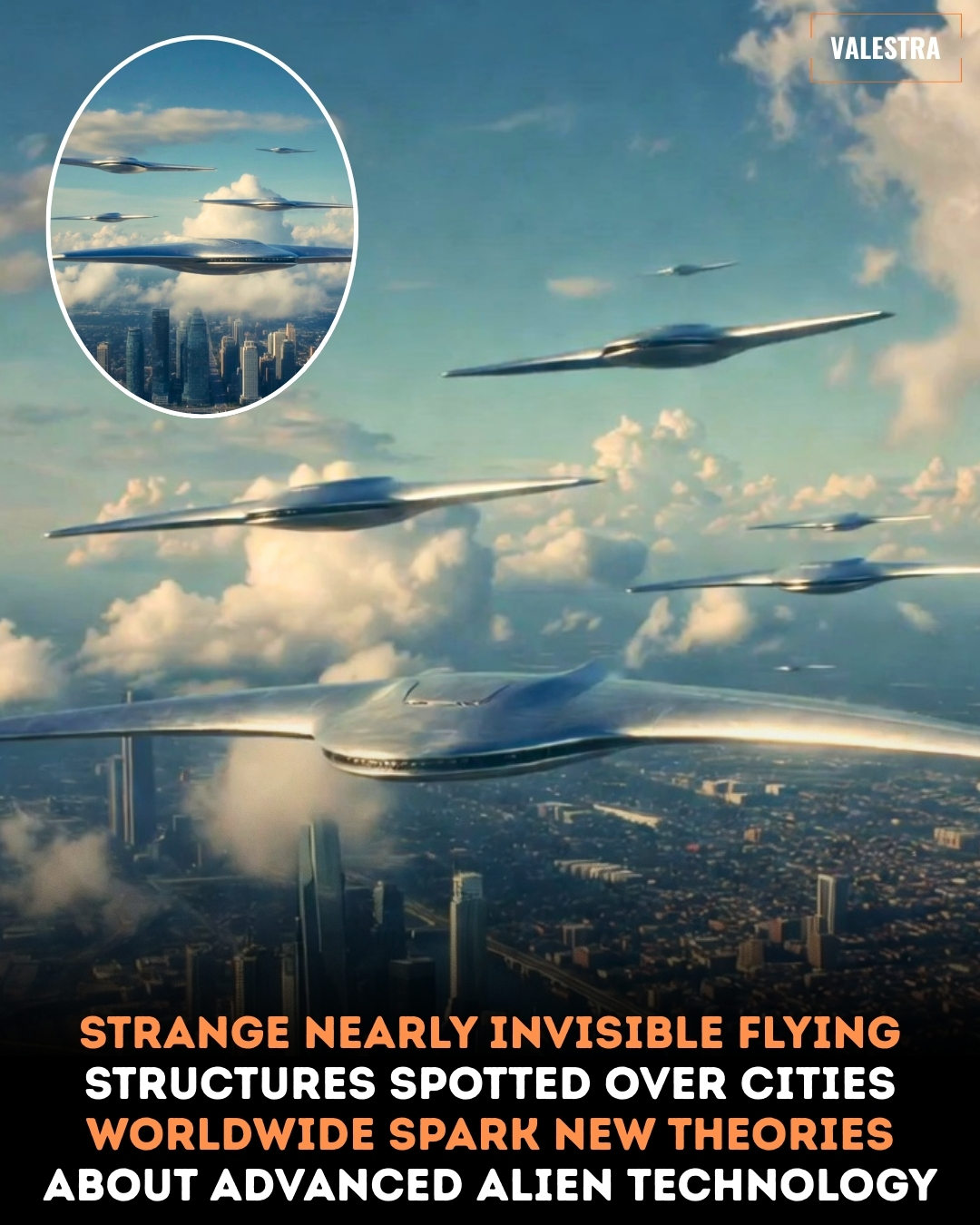 What makes these reports even more intriguing is that the objects often appear almost invisible against the sky. Witnesses say the craft reflect light in unusual ways making them difficult to see until they pass directly overhead. Some observers describe them as enormous triangular or wing shaped structures that move with perfect stability.