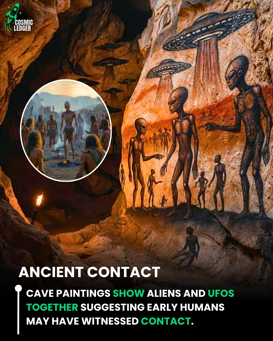 Early humans created these paintings using natural pigments on stone walls. In many scenes, the alien figures appear to be interacting with humans, while UFO shapes are drawn above them. This has led to theories that these paintings may represent real events witnessed long ago.