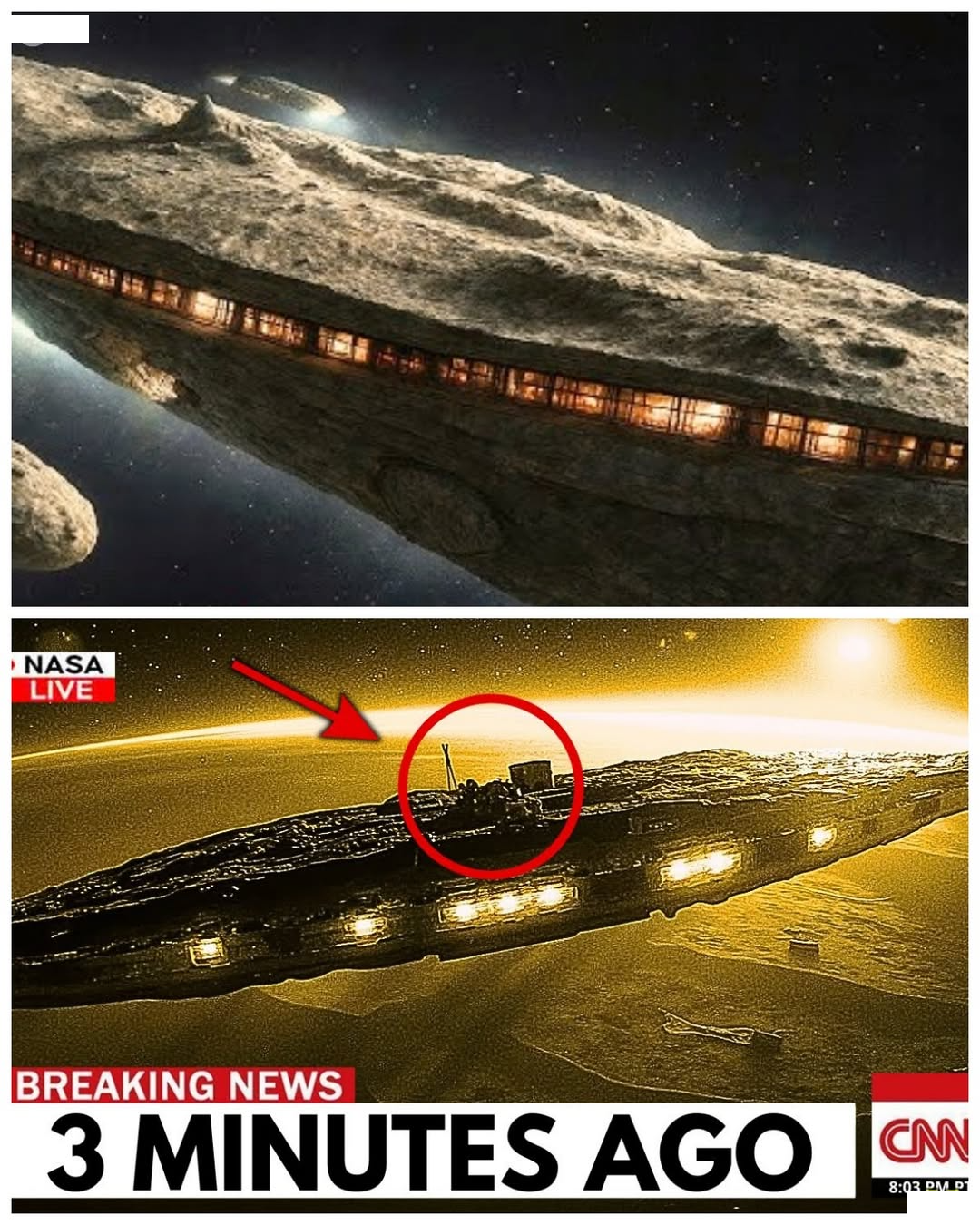 The lower panels provide a terrifying sense of context. The perspective is from Earth orbit, showing the object’s colossal silhouette against the dawn. The inclusion of the NASA graphic, the red circle, and the arrow are standard visual shorthand for an investigation, guiding the eye to a small detail that, under analysis, appears to be an active, metallic structure. The dramatic golden glow emanating from beneath the primary hull is a detail that has polarized researchers: is it an exotic form of thrust, or perhaps a complex sensor array?