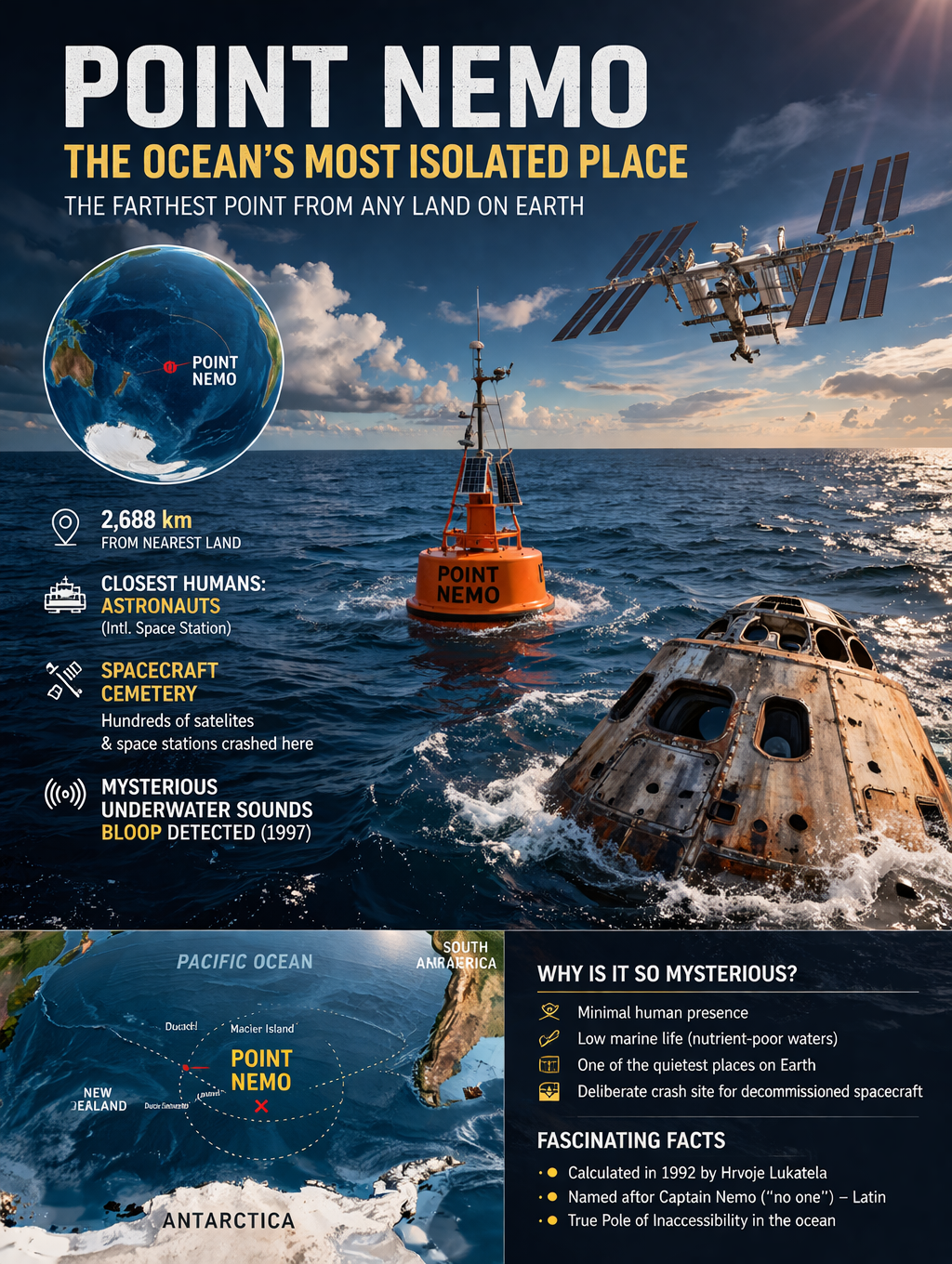 Point Nemo is a place where isolation reaches its absolute extreme. With no nearby land, little life, and even falling spacecraft, it feels almost alien despite being on our own planet.