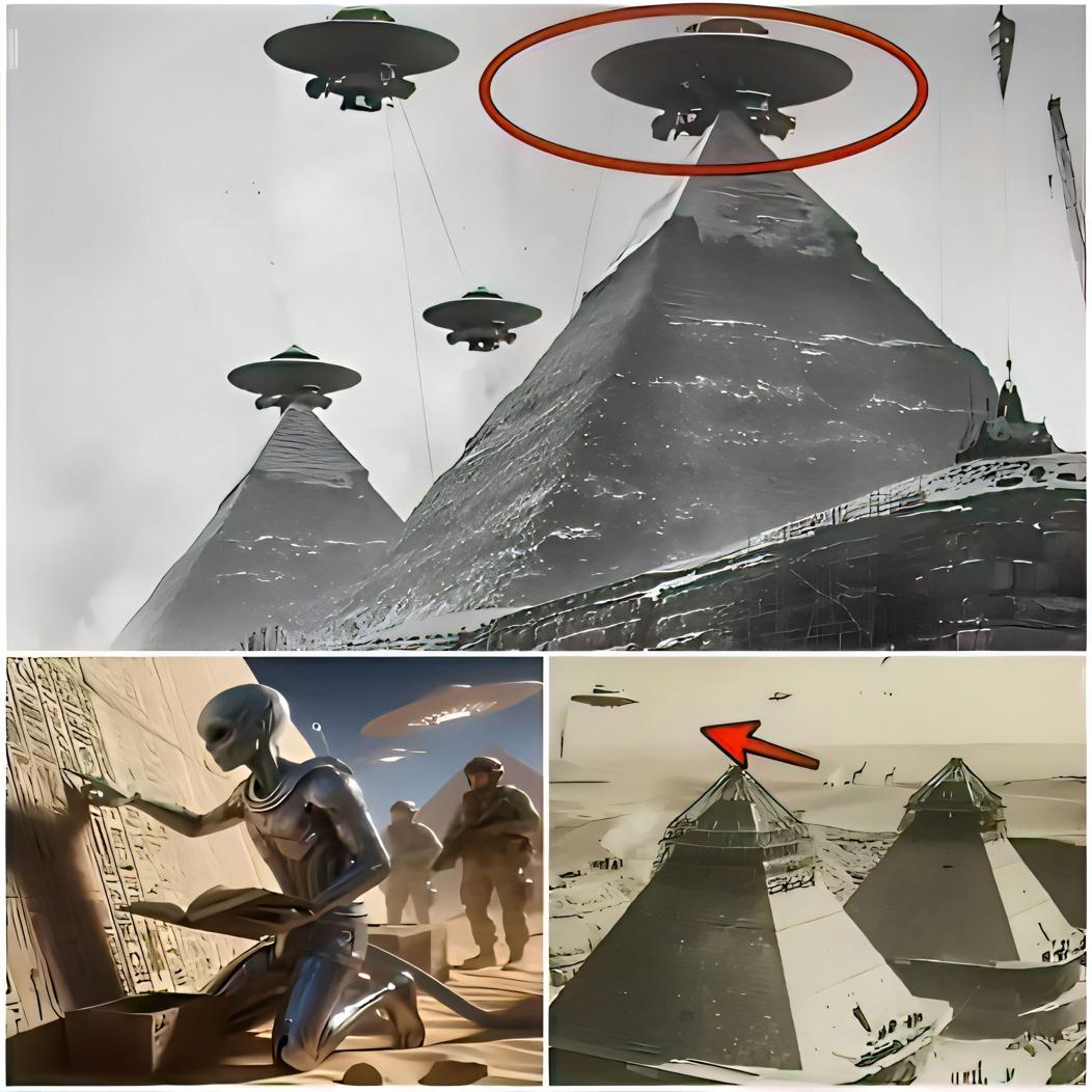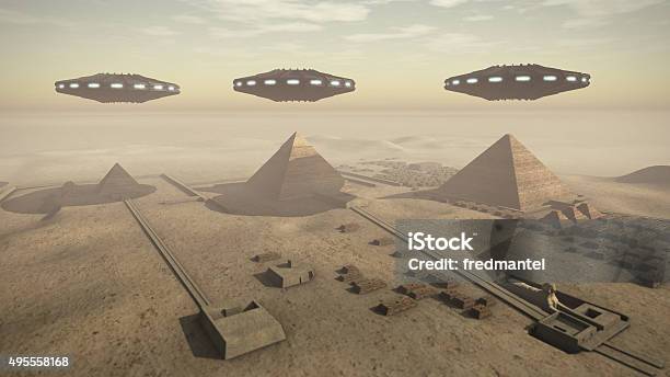 A 3D rendered image of the Giza platform Egypt. Above the monumental tombs and pyramids hoovering some futuristic UFOs.