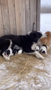 In the heart of a winter silence, where a thick blanket of snow covers the world in an unforgiving white, a scene has unfolded that defies the traditional laws of nature. It is a moment of profound stillness and unexpected beauty: a small cat sitting gently beside a mother dog and her nest of newborn puppies, watching over the fragile lives as if they were her own.