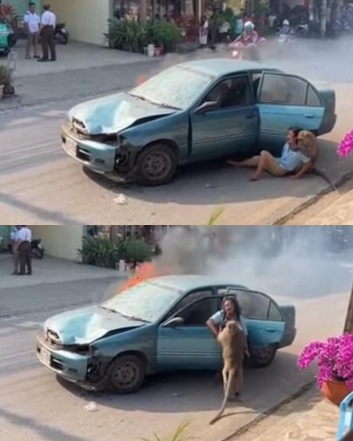 Then, in a moment that would later leave witnesses speechless, the macaque appeared. As if drawn by instinct or memory, it rushed toward the burning car without hesitation. Climbing onto the wreckage, it reached inside, tugging persistently at the woman until she was able to free herself. Those nearby would later recall how the animal refused to retreat, remaining close until she was safely away from the flames. Within moments, the fire surged uncontrollably, consuming what remained of the vehicle.