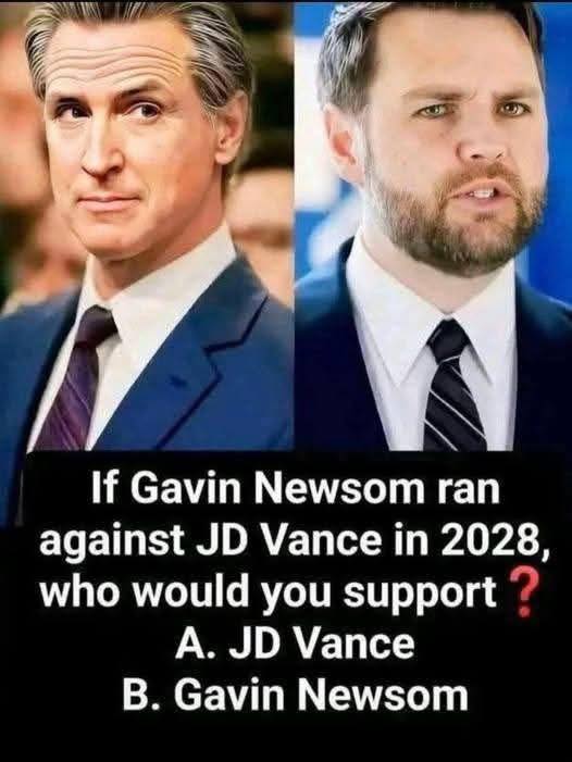 A new political meme circulating online is sparking discussion about a potential future. The image features side-by-side photos of California Governor Gavin Newsom and Ohio Senator J.D. Vance, accompanied by the question: “If Gavin Newsom ran against JD Vance in 2028, who would you support?” This hypothetical scenario presents a fascinating clash of political ideologies and leadership styles that reflects the current polarized landscape of American politics.