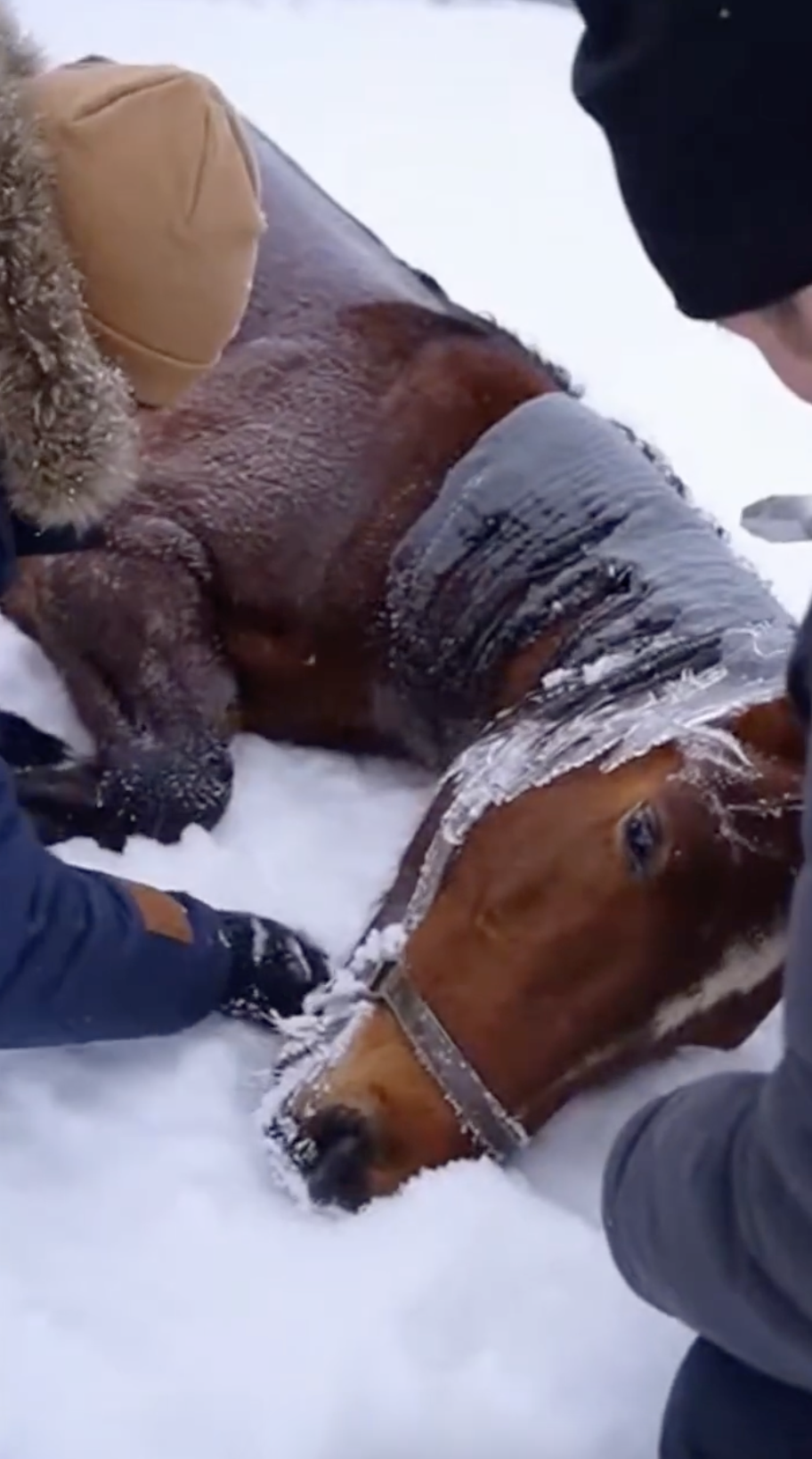 In the silent, white expanse of a freezing winter, a tragedy was unfolding in slow motion. A helpless animal, overcome by the brutal plummet of temperatures, lay motionless in the deep snow. It was cold, weak, and visibly losing its final fight for survival. In those desperate moments, the world felt vast and indifferent, and without immediate intervention, the frost would have surely claimed another life.
