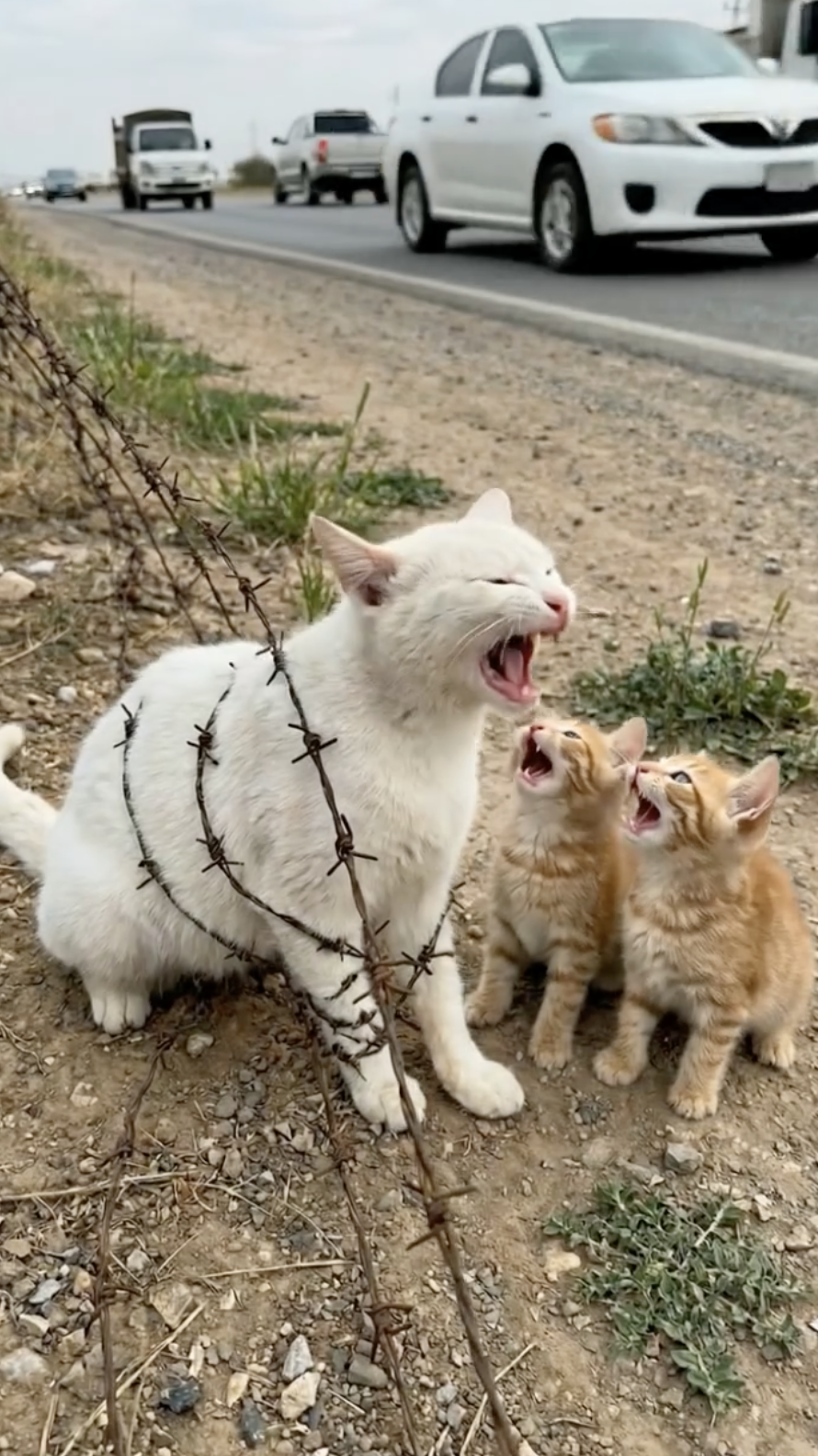 On the edge of a bustling highway, where the roar of passing engines creates a constant wall of sound and danger, a life-and-death struggle was unfolding in the shadows. A mother cat, caught in a cruel tangle of wire, sat immobilized. Every movement brought a new wave of pain, and every passing car was a potential threat to her and the two tiny, desperate kittens huddled by her side.