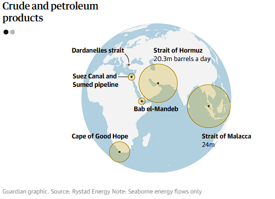In normal times, tankers carry about a fifth of the world’s oil and gas supplies through the narrow channel and on to the rest of the world, while about a third of the global fertilisers necessary for half of the world’s food production pass through in dry bulk vessels.