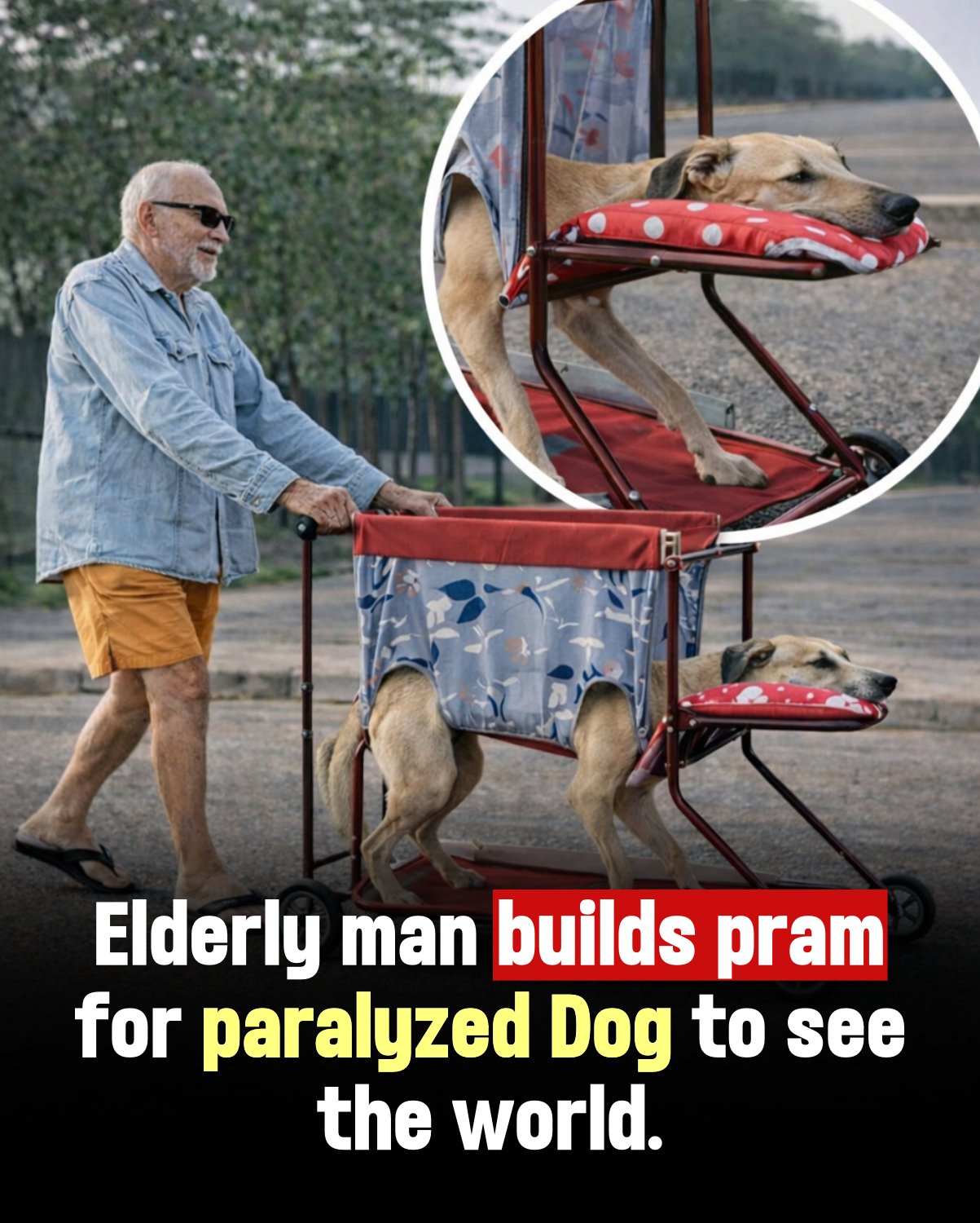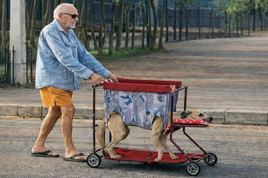 An elderly man has captured hearts around the world after being seen gently pushing his paralyzed dog in a handmade cart, refusing to leave behind the companion who had stood by him for years. Built from simple materials, the small cart allows the dog to sit comfortably, still able to feel the breeze and see the world during their daily walks.