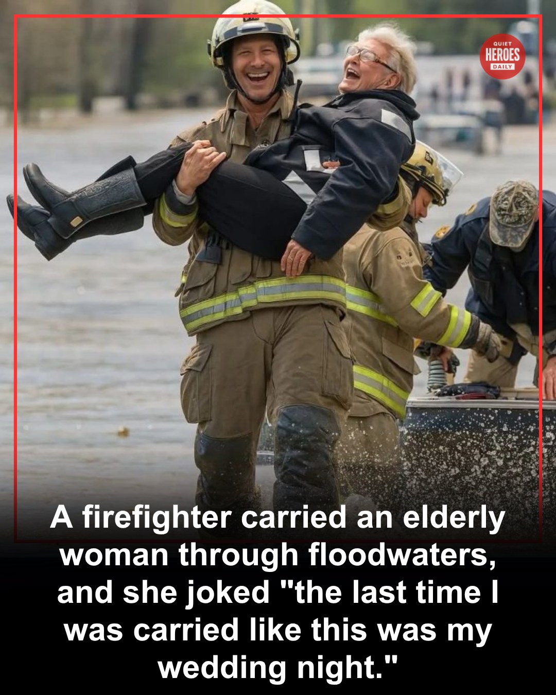 Despite the tension of the moment, the woman remained remarkably calm. In a brief and unexpected moment of humor, she remarked that the last time she had been carried like that was on her wedding night. The comment brought a quiet smile to the firefighter’s face, cutting through the intensity of the rescue.