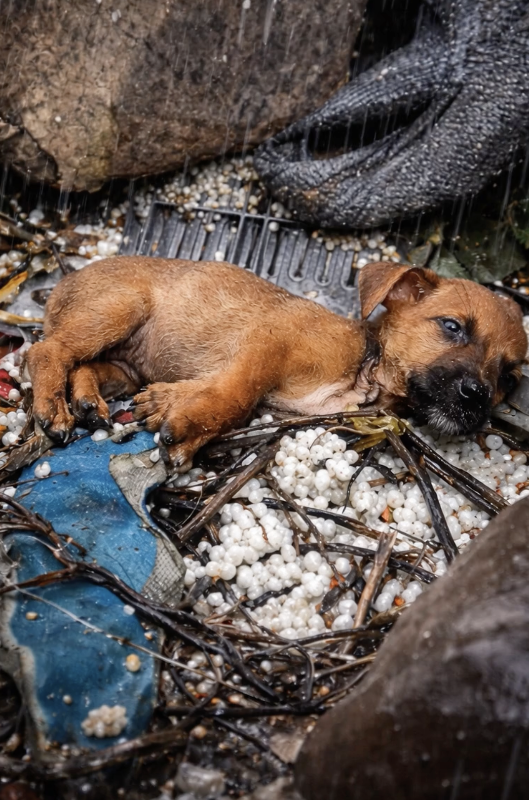 Amidst the harsh, rhythmic lashing of the rain and a ground scattered with ice pellets and debris, a tiny life is curled into a desperate circle. He lies there in a silence so profound it feels heavier than the storm itself. To the passing world, he might look like a discarded shadow, but he is a living, breathing miracle of fragility. His small body is tucked tight, an instinctive and heartbreaking attempt to protect himself from a world that has suddenly grown too big, too cold, and entirely too unforgiving for a creature so small.