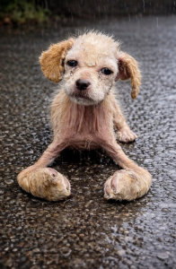 In the relentless, cold rain, on a hard and indifferent stretch of road where no one seems to stop, a tiny life is fighting a monumental battle. His legs are weak, buckling under the weight of his own fragile frame, yet he struggles just to stay upright. His skin is bare and exposed to the elements, trembling with every drop of water that falls. To a passerby, it might look like a small inconvenience, but to him, the world itself feels too heavy for something so small. It is a scene of absolute, isolated vulnerability.