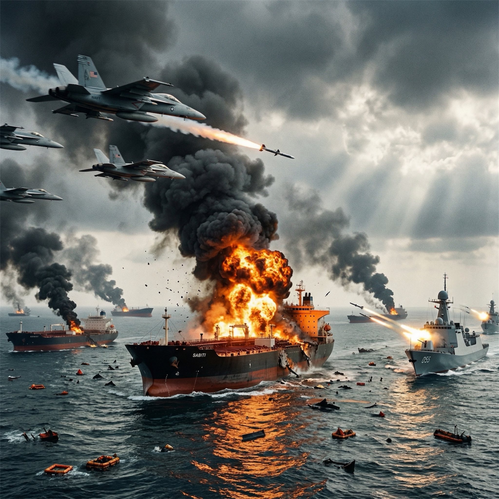 What began as a calm morning over the Strait of Hormuz quickly spiraled into chaos as a series of powerful explosions tore across the water’s surface. In this high-intensity scenario, a sudden, coordinated strike disrupted one of the world’s most critical shipping corridors, halting the movement of oil tankers and sending shockwaves through global markets. Thick plumes of smoke rose into the sky, signaling that a confrontation of unprecedented scale had erupted in a region already burdened with tension.