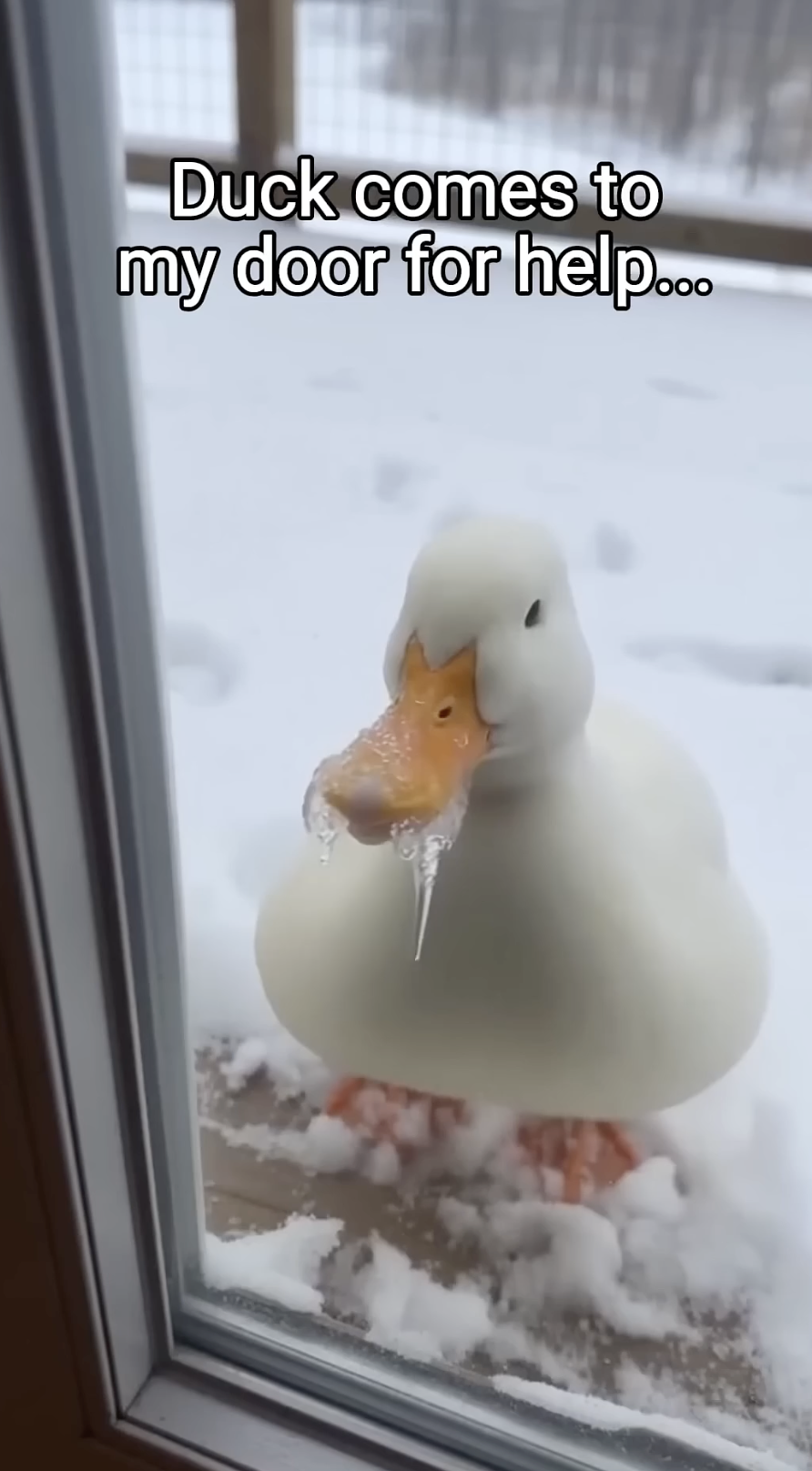 Standing there on the porch was a tiny duck, its frame trembling violently against the sub-zero air. The winter had been particularly cruel to this little wanderer; its beak was partially frozen, with tiny icicles hanging from it like cold, heavy chains. It was as if the season itself had tried to silence its voice and freeze its spirit. Yet, despite the exhaustion and the pain, the duck didn’t panic or turn back into the shadows when the door opened. It simply stood its ground, its wide eyes carrying a plea that required no translation.