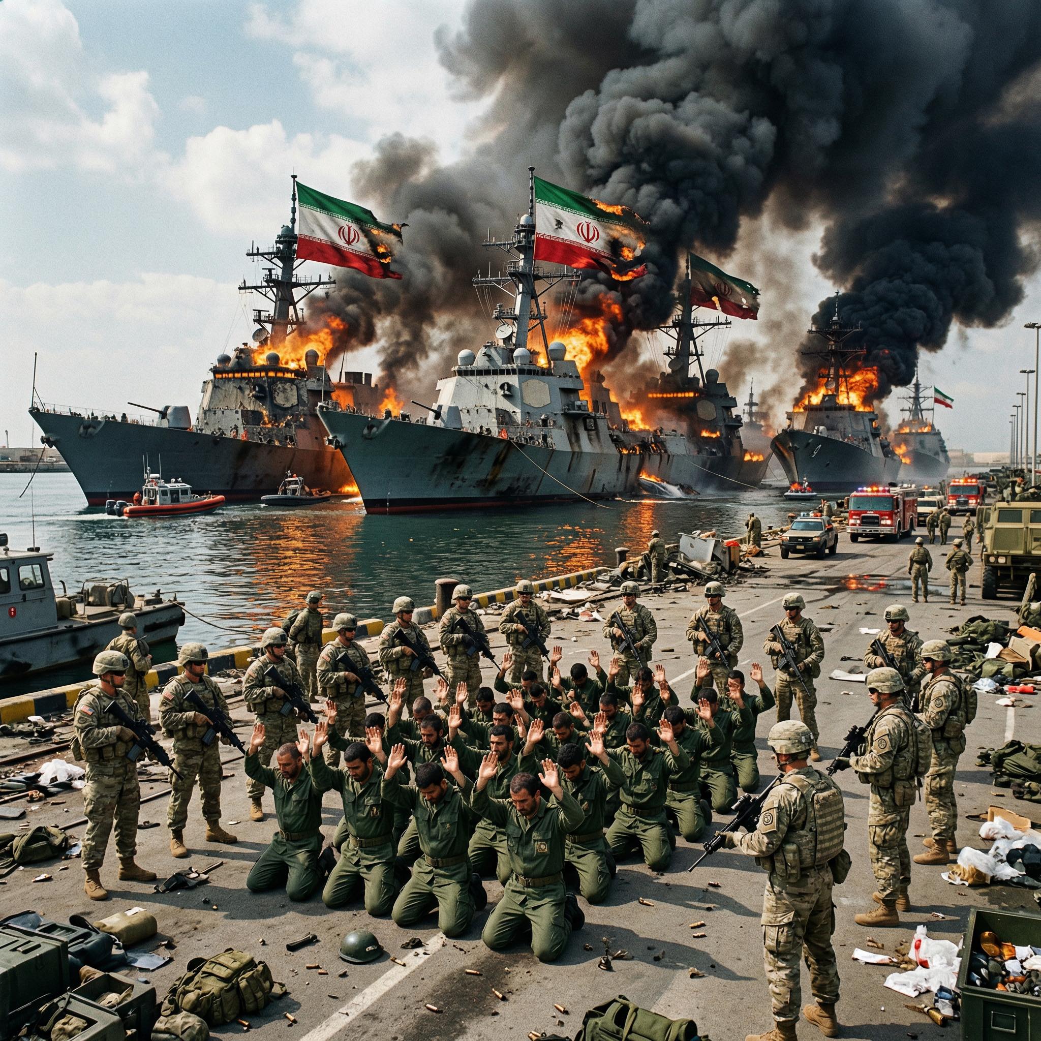 On the dock, twenty Iranian soldiers knelt with their hands raised, surrendering in silence. Their faces told a story of exhaustion, fear, and the crushing realization of defeat. Surrounding them, thirty heavily armed American troops formed a tight perimeter, weapons trained and eyes locked, maintaining absolute control in a moment stretched by tension.