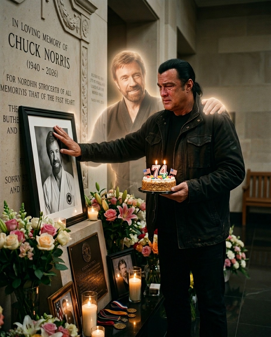 In a quiet corner filled with flowers, candles, and fading light, a deeply emotional moment unfolds. A man stands before a memorial engraved with the name Chuck Norris, gently placing his hand on a framed portrait as if trying to hold onto something that can no longer be touched. In his other hand, a small birthday cake flickers softly, its candles glowing with a fragile warmth that contrasts the heaviness in the air.