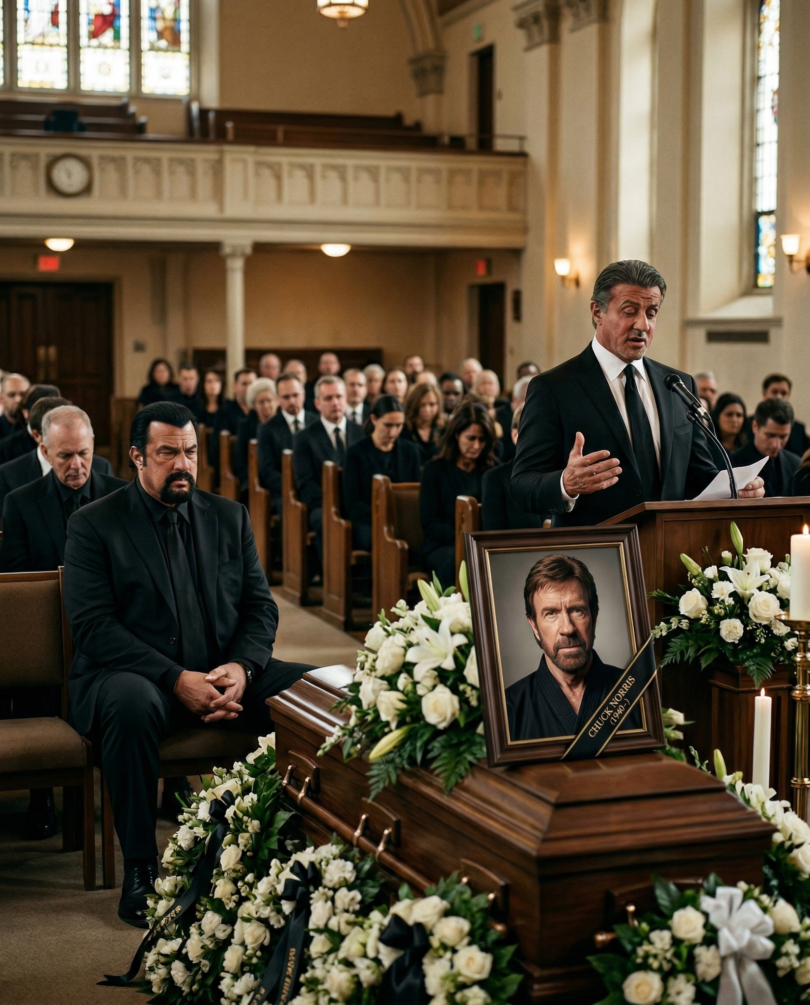 The church stood still, wrapped in a heavy silence that words could barely touch. Rows of mourners dressed in black sat shoulder to shoulder, each carrying their own quiet grief. At the front, a single photograph rested beside the casket—capturing a face that once held strength, laughter, and a life now gone.