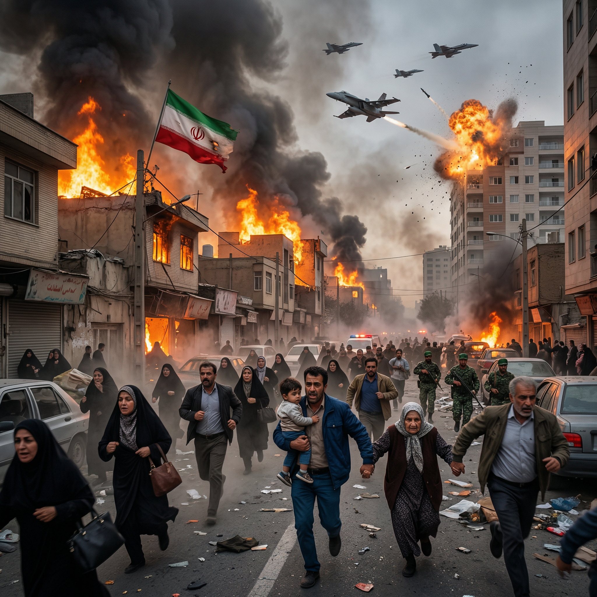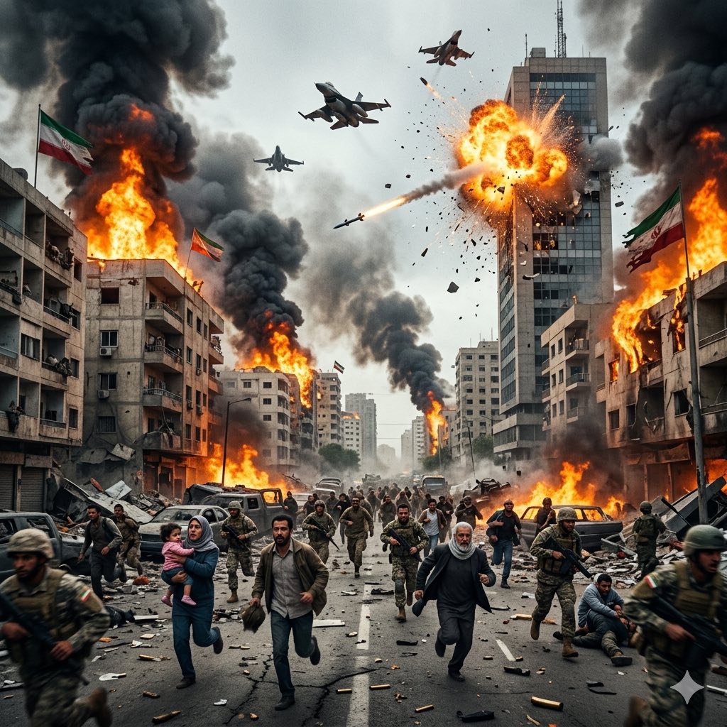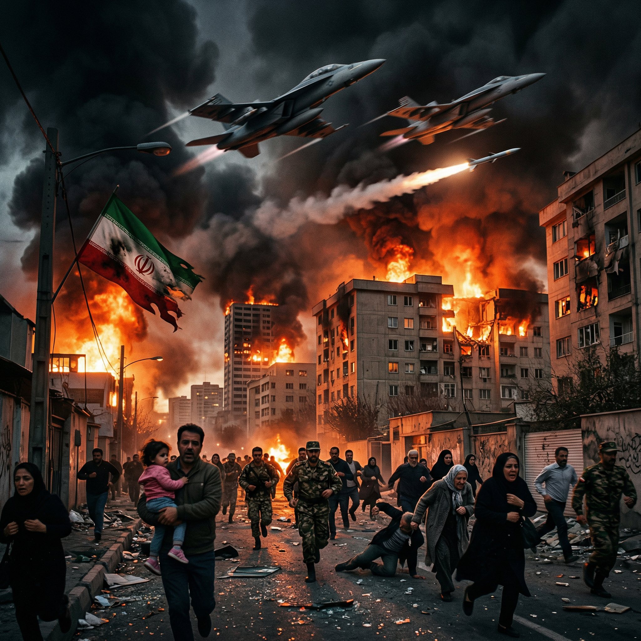 The sky above an Iranian city burned crimson as relentless airstrikes tore through the darkness. Waves of explosions lit up the night, engulfing residential areas and high-rise buildings in massive flames. The ground shook violently with each impact, while thick black smoke rose into the air, swallowing the skyline and turning the city into a scene of chaos and destruction.