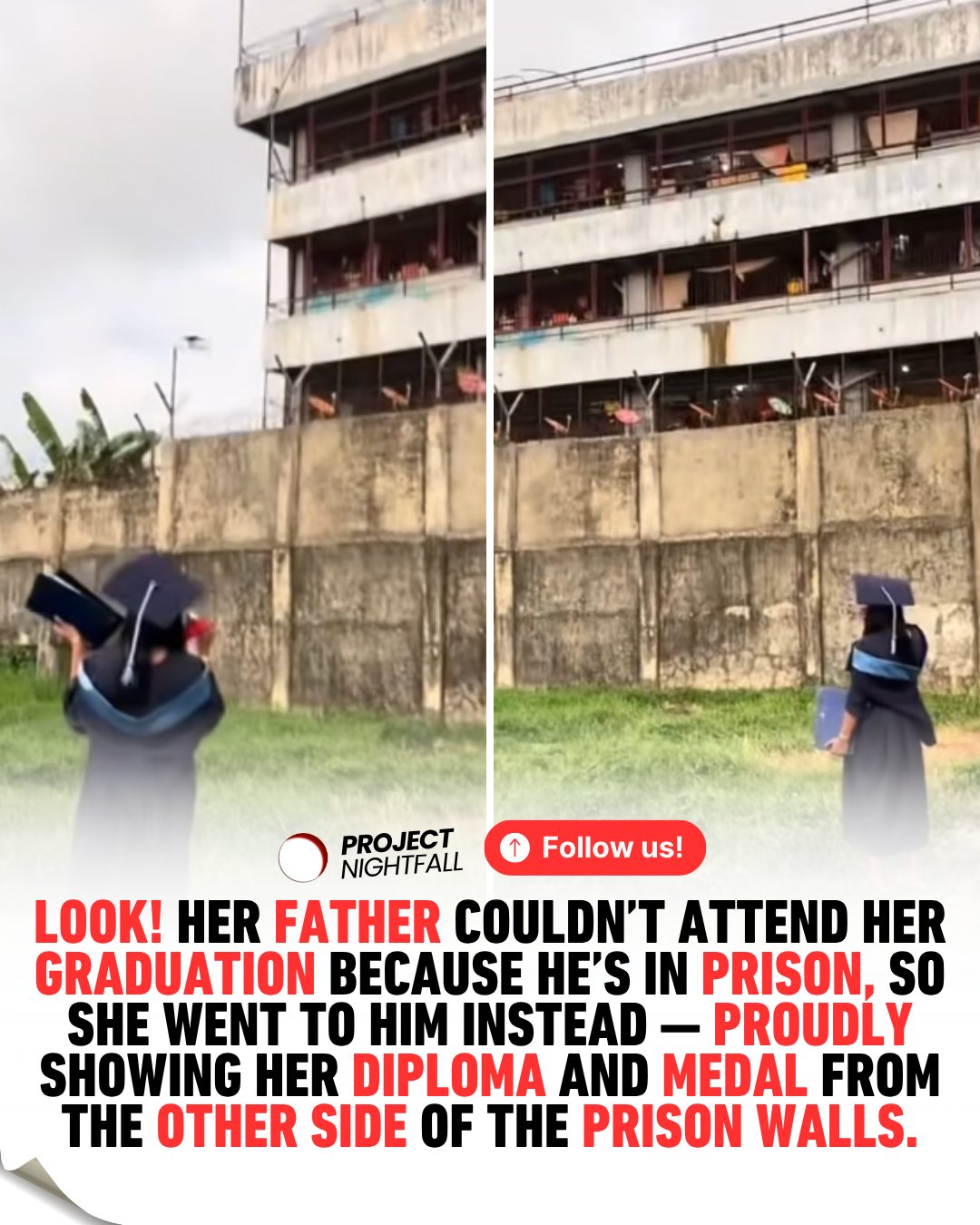 But instead of letting that absence define the moment, she chose a different path. Dressed in her graduation gown, holding her diploma and medal, she stood outside the prison — close enough that he could see her from the other side. It was not a stage, nor a ceremony filled with applause, but it carried something far more powerful: love, resilience, and connection.