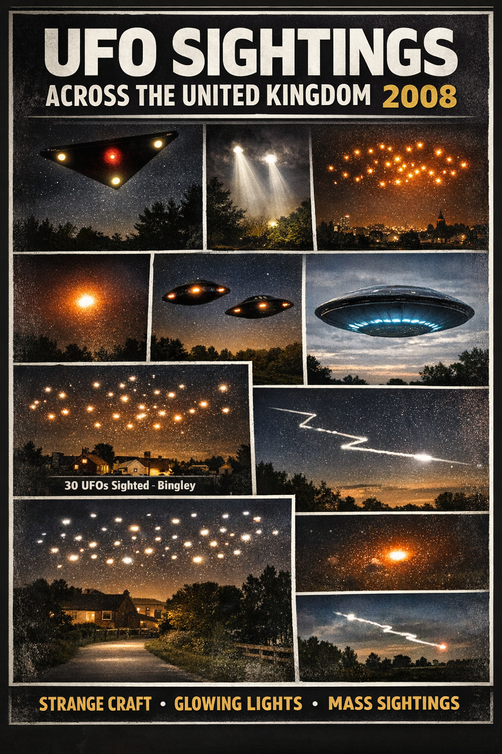 A particularly unusual report from Bingley, West Yorkshire, claimed that around 30 UFOs were seen in the sky at the same time. The objects appeared as bright lights moving together before fading away.