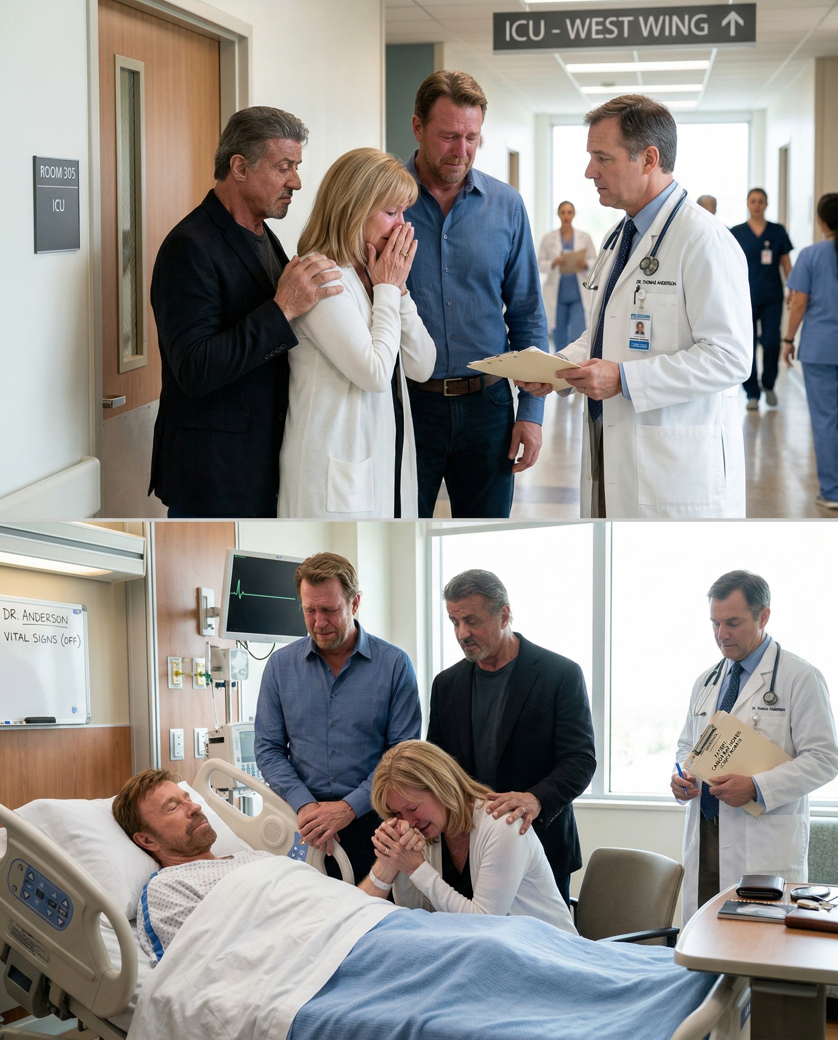 In the quiet, sterile hallway of a hospital, beneath the stark sign pointing toward the ICU, a moment of profound sorrow unfolds. The atmosphere is heavy, as if the very air understands the gravity of what has just been spoken. A doctor stands solemnly, holding a clipboard, his voice likely measured but compassionate. Before him, a grieving family struggles to process the unimaginable news—the passing of Chuck Norris, a man known to the world as an invincible icon, yet to them, simply a beloved husband and father.