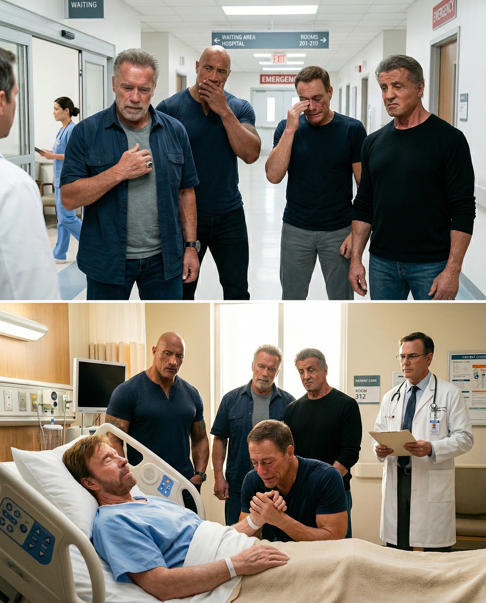 The sterile brightness of the hospital corridor could not hide the weight that hung in the air. Four men—legends in their own right—stood in silence, each carrying a different expression of grief. Arnold Schwarzenegger held his chest as if steadying his breath, his usual unshakable confidence replaced by quiet concern. Beside him, Dwayne Johnson lowered his head, his hand covering his mouth, struggling to process what they had just been told. Jean-Claude Van Damme wiped away tears, unable to contain the emotion that surged within him. And Sylvester Stallone stood still, his face tense, his eyes reflecting disbelief.