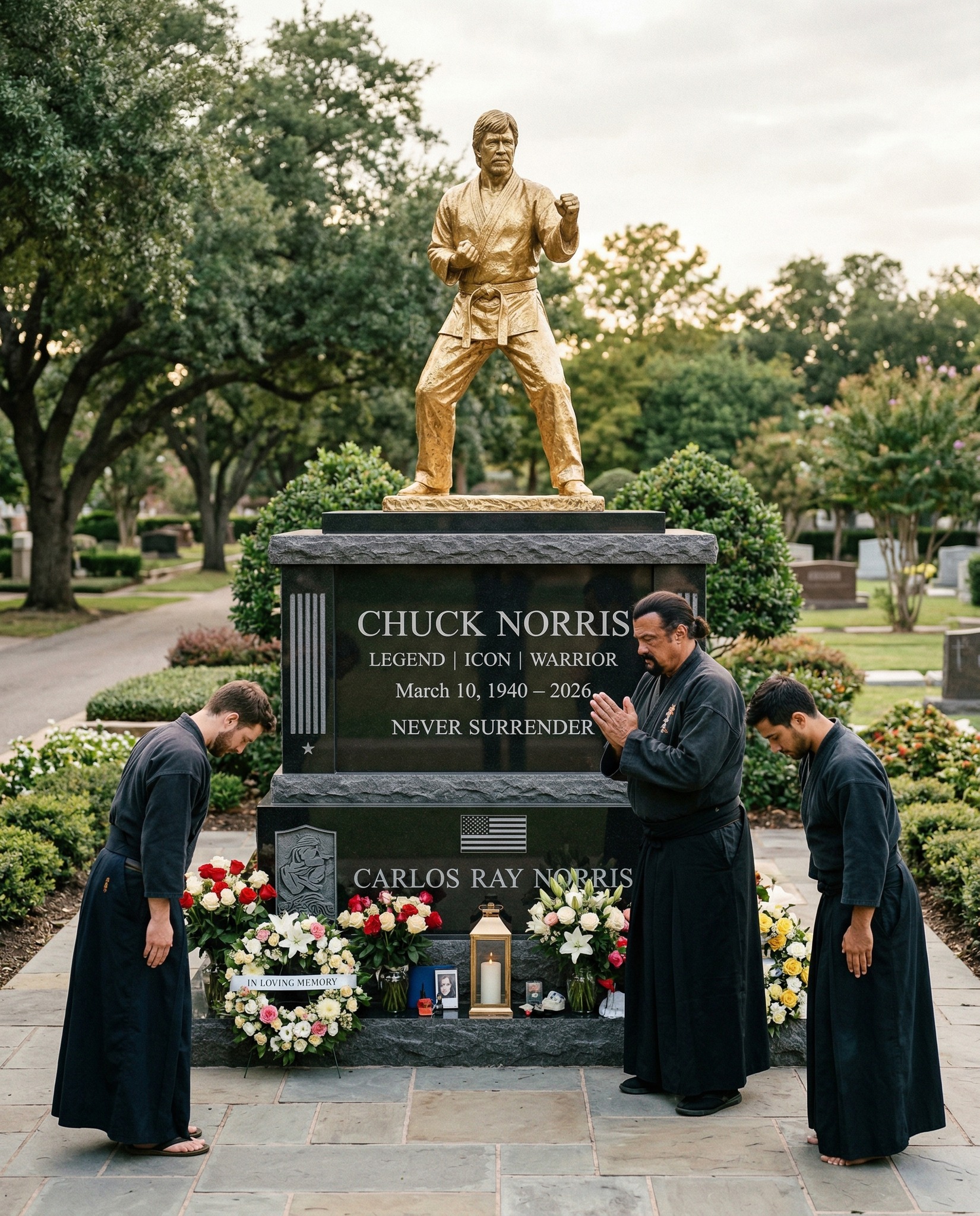 At Norris’ grave, Seagal left no flowers, no physical tokens, but only the bow — a gesture that spoke louder than any object could. Through this simple act, he imparted a lesson to his students: that the most meaningful tribute you can give to a life well-lived is to commit yourself to living one worthy of that legacy. The inscription on the monument, “NEVER SURRENDER,” is not just about Norris, but about the responsibility to live with honor, courage, and dedication. Seagal understood that, and now, his students are beginning to. Chuck Norris’ legacy continues, teaching through every moment of life, even in his absence.
