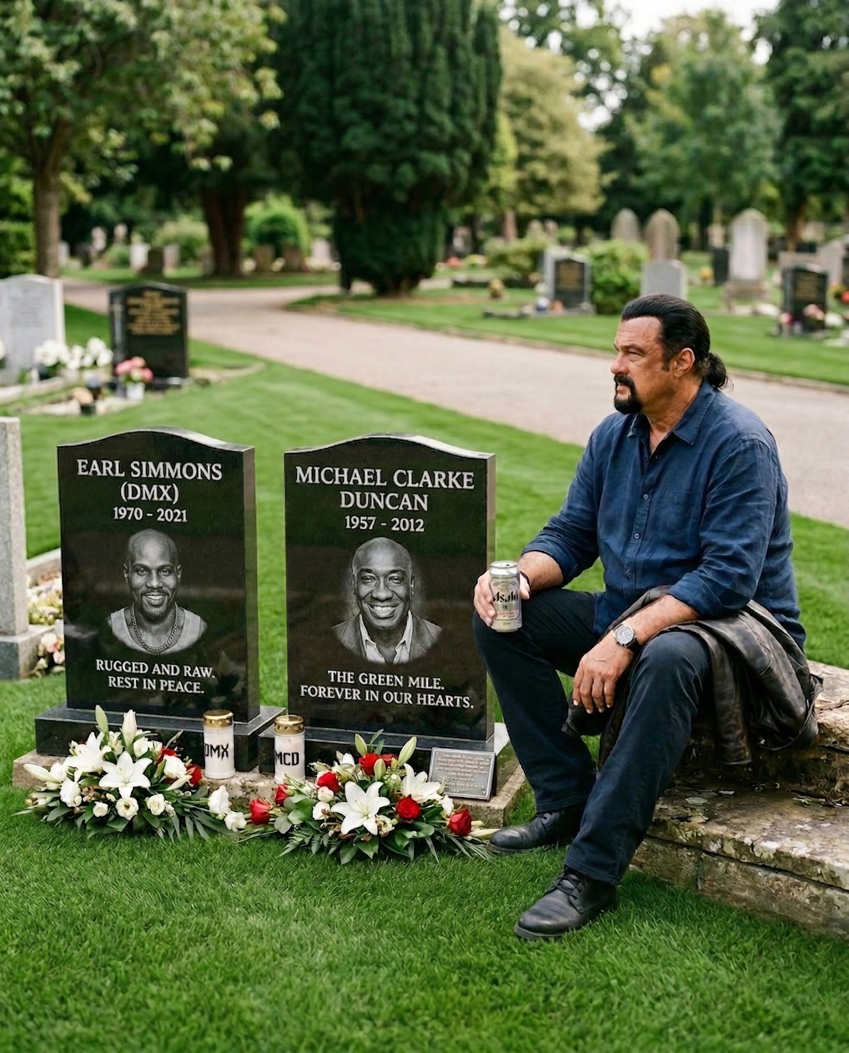 Now, Seagal sits between two graves, holding a beer, not drinking it but holding onto a ritual of friendship. He thought about placing a can on each grave, as a tribute, but something about it felt wrong. Instead, he sits silently between Earl (DMX) and Michael (Duncan), two men whose losses came too soon. The beer sits in his hand, untouched, as he reflects on the silence that now surrounds him.