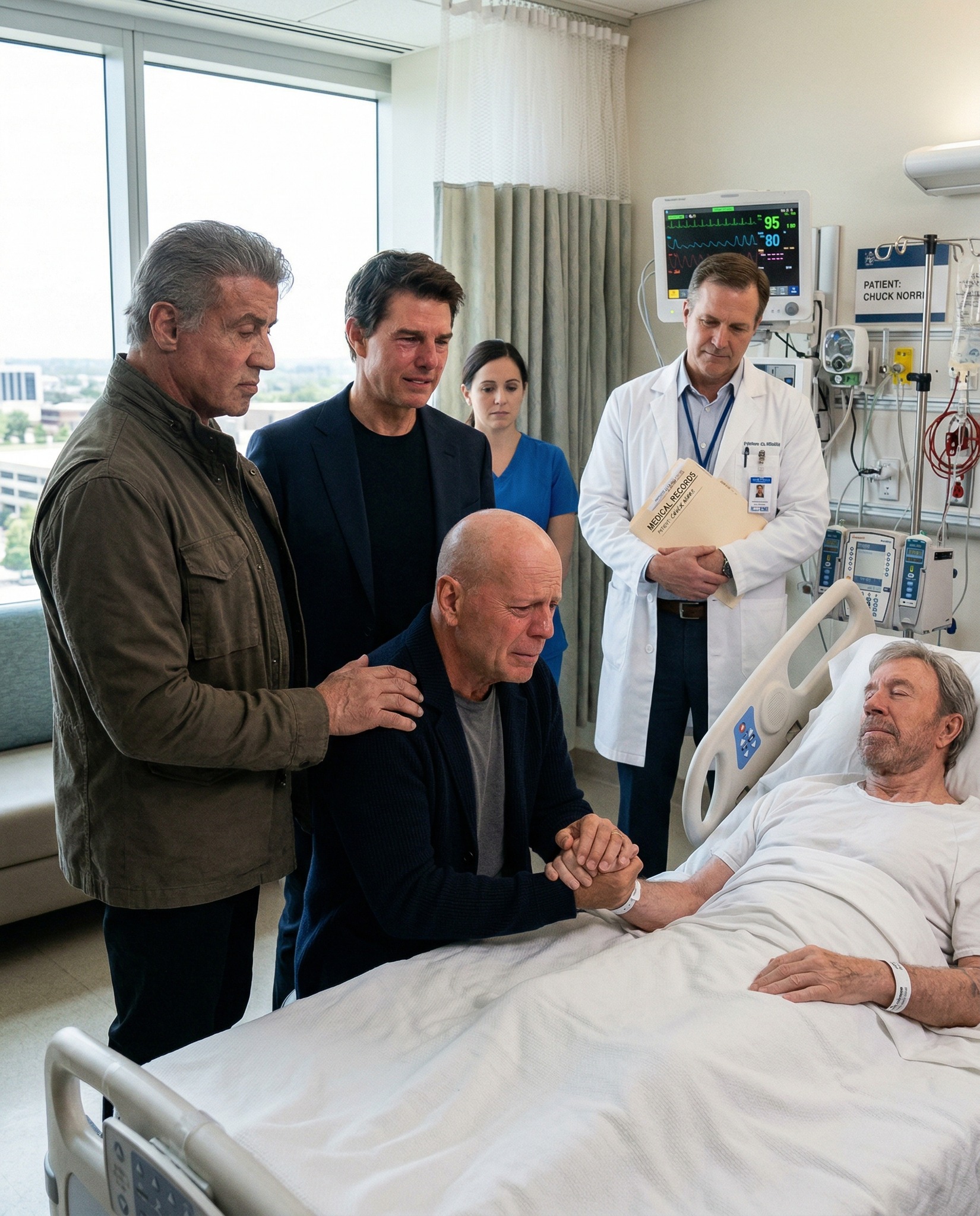 At the bedside, Bruce Willis held Chuck Norris’s hand. His usual tough demeanor gave way to tenderness as he knelt, trying to hold onto a legend slipping away.