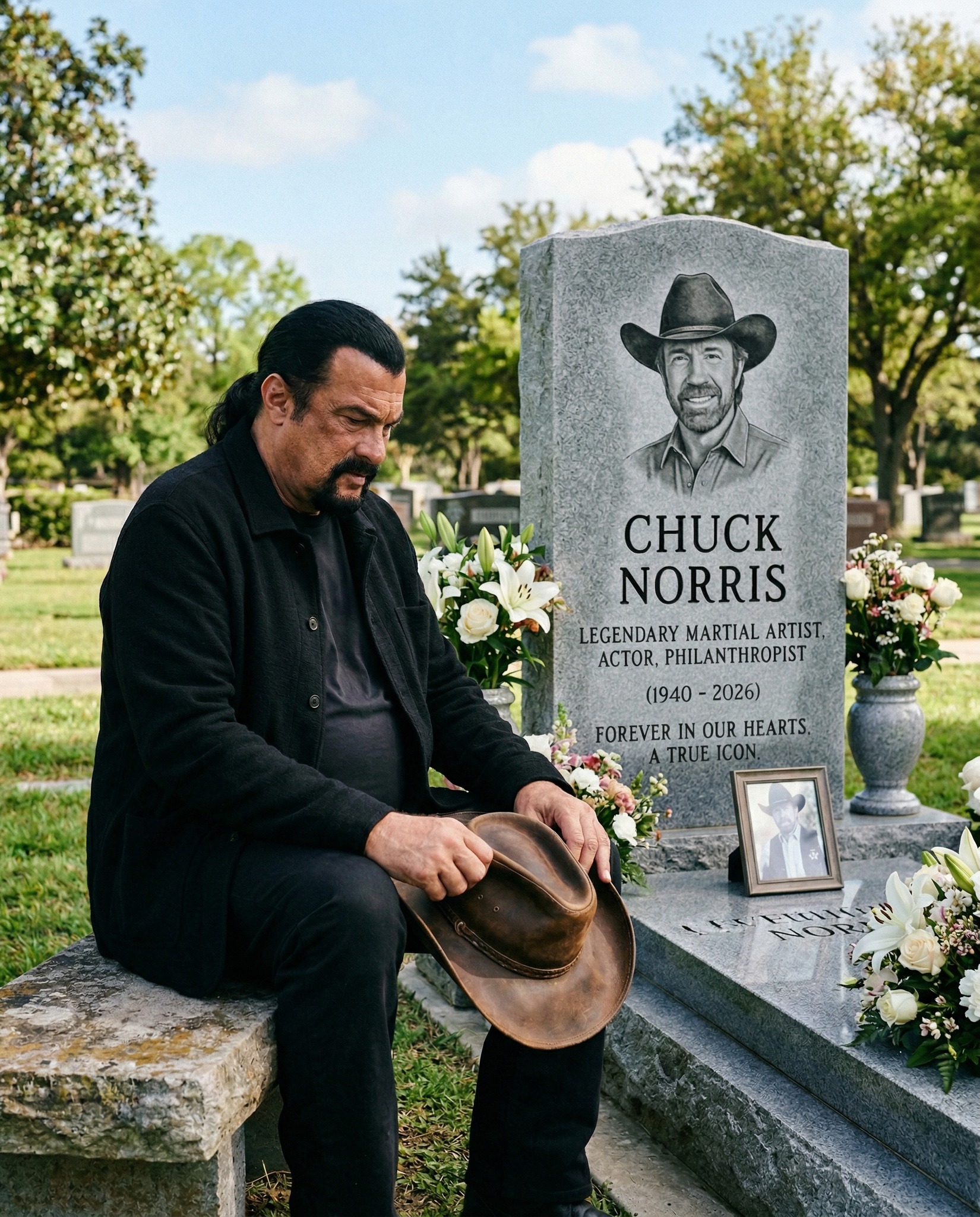 And somewhere, on a quiet morning just days later, Steven Seagal drove to a cemetery, sat down on a stone ledge beside a headstone he didn’t yet fully believe was real, took off a leather cowboy hat that didn’t belong to him — Chuck’s kind of hat, a Texan’s hat, a Walker’s hat — and held it in both hands with the careful stillness of a man trying to hold something that keeps slipping through his fingers.