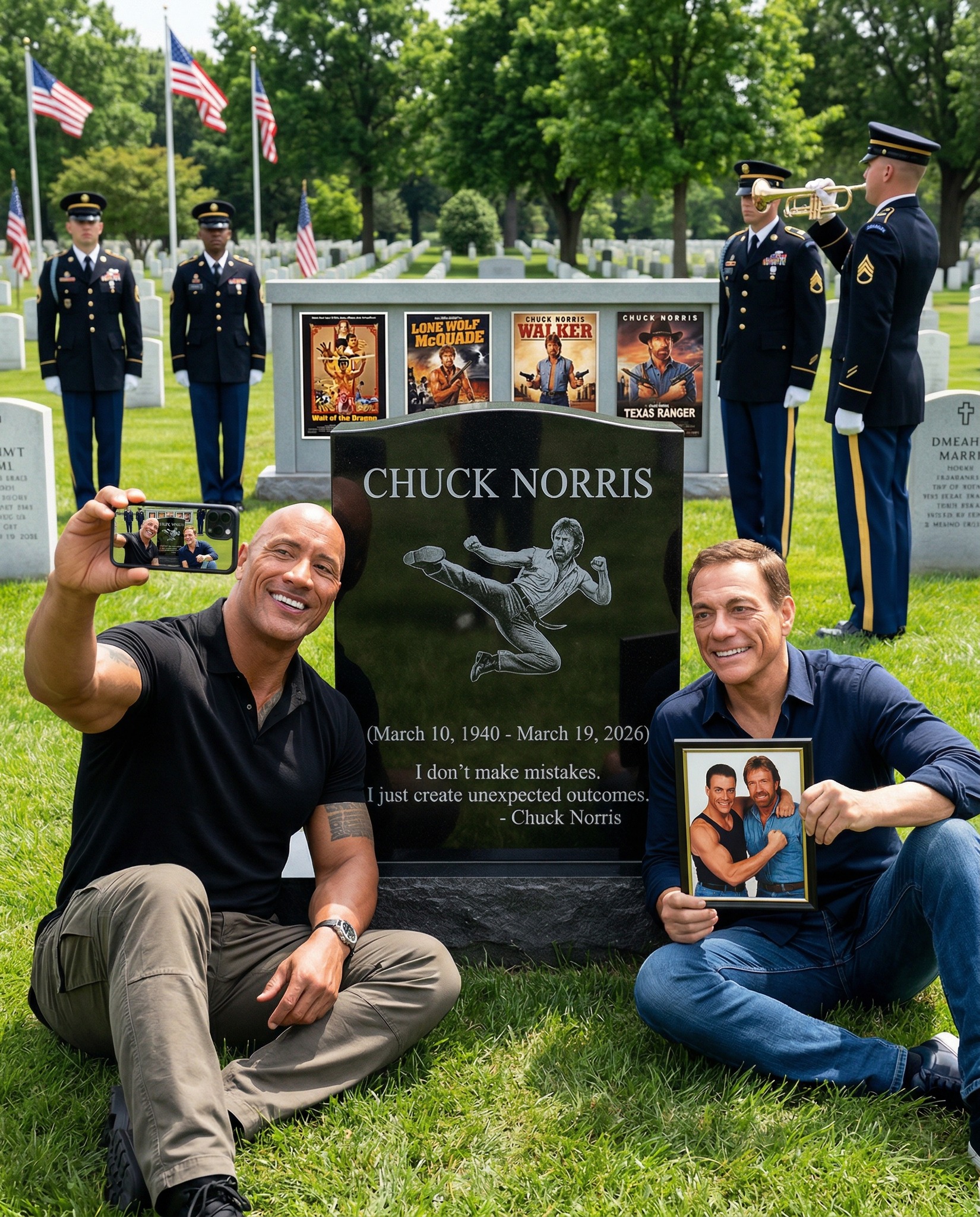 Dwayne Johnson, known worldwide for his charisma and strength, kneels beside the grave with a gentle smile that carries both admiration and nostalgia. Holding up his phone, he captures a selfie—an image that blends modern expression with deep respect. Beside him, Jean-Claude Van Damme sits quietly, holding a framed photograph of himself with Chuck Norris. The picture reflects a moment of camaraderie, a shared bond between two martial artists who helped shape the global perception of strength, discipline, and honor.