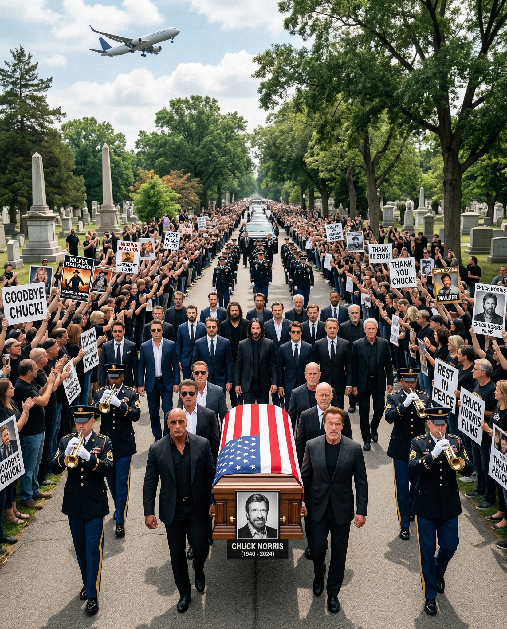 On both sides of the road, fans stood shoulder to shoulder, holding signs that read “Rest in Peace,” “Thank You, Chuck,” and “Legend Forever.” Some held posters from *Walker, Texas Ranger*, others from *Missing in Action*, and many from *Way of the Dragon*. Tears filled their eyes as they watched the procession pass, their applause soft, their voices trembling with emotion.