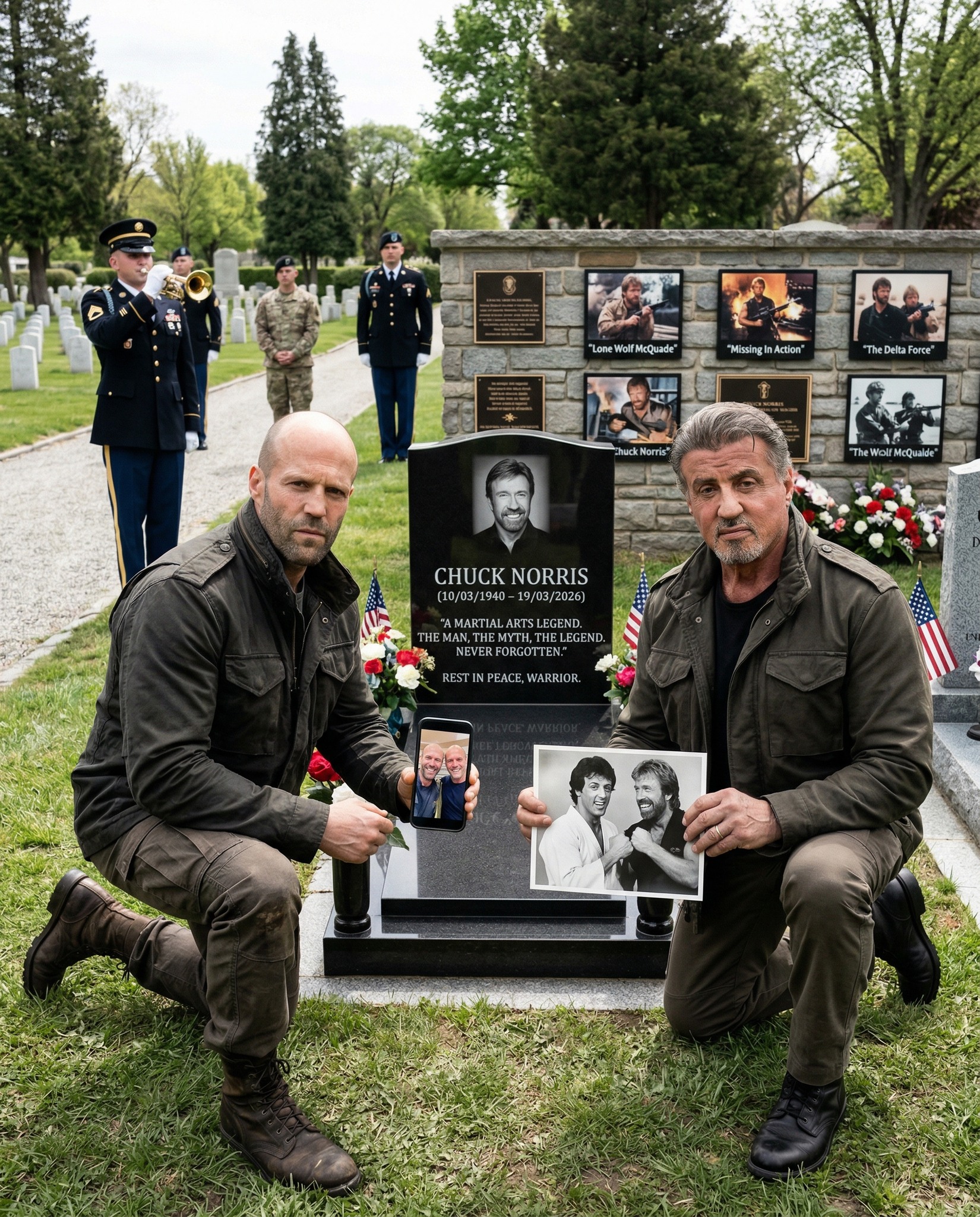 On a quiet afternoon beneath a pale sky, the stillness of a cemetery is gently broken by the sound of a lone trumpet. The solemn melody drifts across rows of white headstones, each marking a story, a life, a legacy. Among them stands a polished black gravestone engraved with the name that once echoed across cinema screens and martial arts arenas: Chuck Norris. Today, two fellow action icons—Sylvester Stallone and Jason Statham—have come not as stars, but as admirers, paying tribute to a man who helped define their genre.
