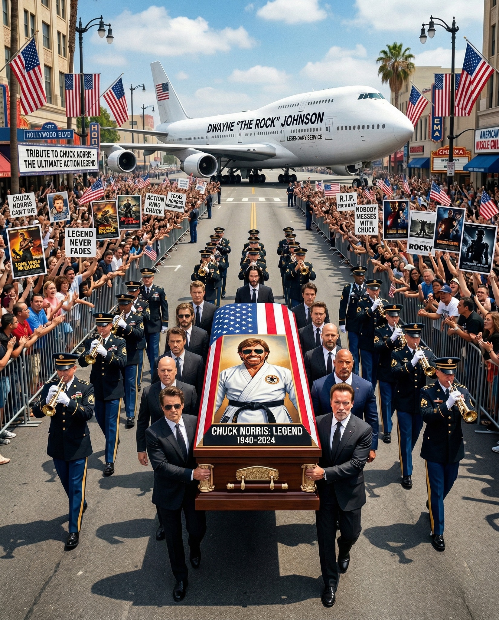 On both sides of the street, thousands of fans gather. Their hands hold signs that read “Legend Never Fades,” “Chuck Norris Forever,” and “The Ultimate Action Hero.” Some hold posters of his iconic roles—others simply stand with tears in their eyes, unable to put into words what he meant to them.