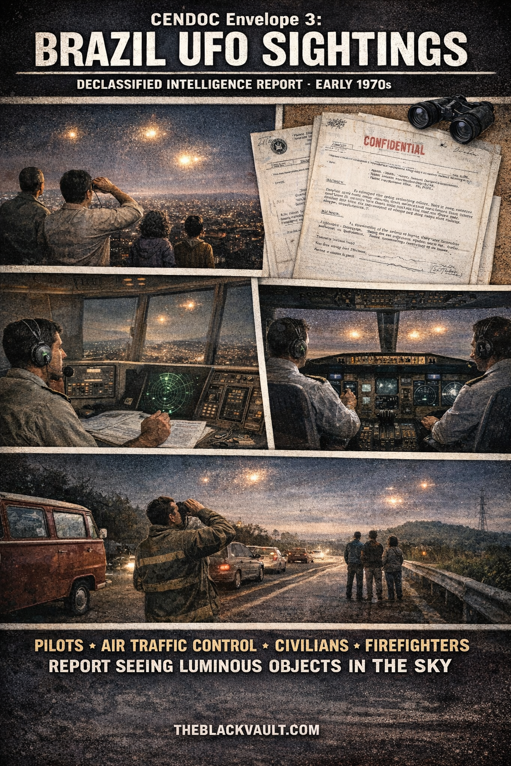 A declassified intelligence compilation known as CENDOC Envelope 3 (1972) contains a collection of witness accounts describing unidentified luminous objects observed in the skies over Brazil.