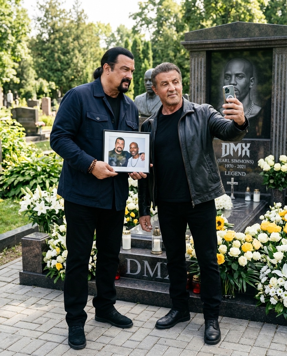 Stallone taking a selfie at his grave with Steven Seagal holding a framed photo of himself and DMX is, objectively, the most DMX-appropriate tribute imaginable. It is alive. It is specific. It is two large men in black leather and denim doing something slightly ridiculous in the service of something completely sincere — which is, more or less, the definition of everything DMX ever made.